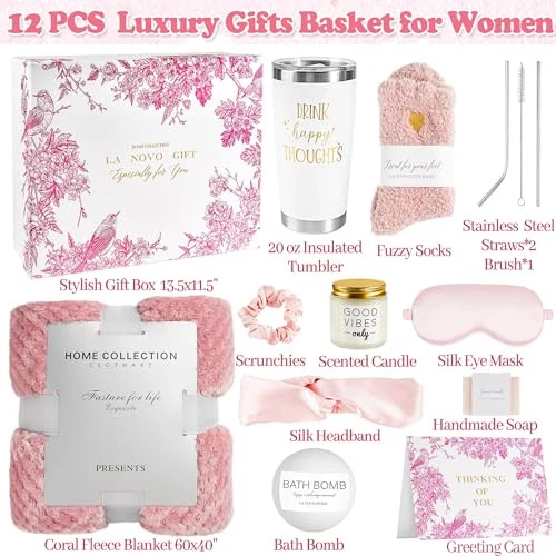 Return Policy Fast Delivery Trusted seller Valentines Day Gift Basket for Women, Pink Self Care Get Well Soon Gifts, Thinking of You Relaxing Spa Care Package with Blanket, Unique Birthday Gifts for Mom Her Best Friends Sister Wife Product Description Polyster ELEGANT CARE PACKAGE FOR WOMEN: Pink Gifts Basket for Women, a Spa Gifts Set, is a thoughtfully curated selection tailored with love and care to delight and pamper the exceptional woman in your life. It aims to bring her immeasurable joy and offer a heartfelt embrace and affection. Ideal as Birthday Gifts, Valentines Day Gifts for Her Girlfriend or Wife, Mothers Day Gifts for Mom, Anniversary, Christmas Gifts for Women, Relaxation Gifts for Women, Get Well Soon Gifts, Thinking of You Gifts 12PCS SELF CARE GIFTS FOR WOMEN: The Spa Gifts Box for Women, comprising 12PCS of exquisite self-care items, offers a comprehensive range of thoughtfully designed gifts. This stylish box contains a luxurious flannel blanket, a 20oz insulated tumbler, with stainless straws set, a lavender-scented candle, a handmade soap, a bath bomb, a silk eye mask, a silk headband, a scrunchie, fuzzy socks, a greeting card, and an elegant gift box. This unique birthday gift for women is sure to bring warmth to her heart. Send her this spa gift box to enable her to enjoy a cozy and leisurely moment LUXURIOUS CORAL FLANNEL BLANKET: Our gift for women comprises a blanket crafted from luxurious flannel, offering unparalleled softness, coziness, and fluffiness. This blanket ensures total comfort and relaxation, embodying the sentiment " Home Collection Quality Standard". Additionally, the fuzzy socks adorned with a gold heart are exceptionally soft and supremely comfortable, ideal for keeping your lady warm at any time. This birthday gift basket, complete with this blanket, is the perfect way to express your warmest love and hugs INSULATED VACUUM TUMBLER: Crafted from 18/8 food-grade stainless steel, boasting double-walled vacuum insulation, this sweat-resistant 20oz insulated tumbler with lid effectively maintains beverage temperature for up to 10 hours for cold beverages and 5 hours for hot beverages. Ideal for iced coffee, tea, wine, juice, champagne, smoothies, sodas, milkshakes, and more. The uplifting quote "Drink Happy Thoughts" adds a cheerful touch, brightening her days and eliciting a smile as she enjoys her beverage, making it a perfect gift for relaxation or friendship ELEGANT COZY SPA GIFTS: This luxurious lavender-scented candle, crafted from pure plant essential oil and natural soy wax, is non-toxic and designed to burn smokelessly and evenly for an extended duration of up to 30 hours. Accompanying this candle is a handmade goat milk soap and an exquisite bath bomb, both releg a captivating fragrance. These gifts will undoubtedly provide her with an indulgent and bubble bath experience, aiding in the relaxation of her mind and body. A thoughtful and elegant spa gift set, perfect for female birthdays or as a special gift for Mom or Sister EXTRA LUXURY ADDED: The set includes a silk eye mask, a silk hairband, and a hair scrunchie, exceptionally soft, comfortable, lightweight, and fashionable. They are ideal as relaxing accessories to pamper your special lady. Express your heartfelt wishes on the greeting card. offers a satisfaction guarante. If you have any issues with our unique gifts for women, please do not hesitate to contact us for a solution. Enjoy risk-free shopping and select this stylish bath spa gift set as a birthday or Christmas present for your sister, mother, or any special woman in your life WRAPPED WITH CARE AND READY TO GO: Skip the wrapping! Our care package for women is all set to be delivered straight to the recipient's doorstep. This comprehensive wellness and relaxation gift basket is the perfect birthday box, self-care box, or sympathy care package for your friends, family members, or anyone you hold dear. It contains a thoughtful selection of items that promote relaxation, rejuvenation, and overall well-being, making it a thoughtful and meaningful gift for any occasion Shipping Returns Payment Shipping Shipping is FREE to all addresses other than APO/PO boxes in the lower 48 states. All our stock ships from US-based warehouses. Shipped via USPS or UPS (depending on location and package weight) Unless stated otherwise, all orders will ship within 24-72 hours of your payment being processed. Check our feedback to see the great reviews of FAST shipping we offer. Returns Seller does not accept returns Payment We currently accept payment via eBay managed payments only. Once payment is cleared, we will dispatch your shipment within 1-3 business days. Please refer to the "Shipping" tab for more information regarding shipping speed to your destination.