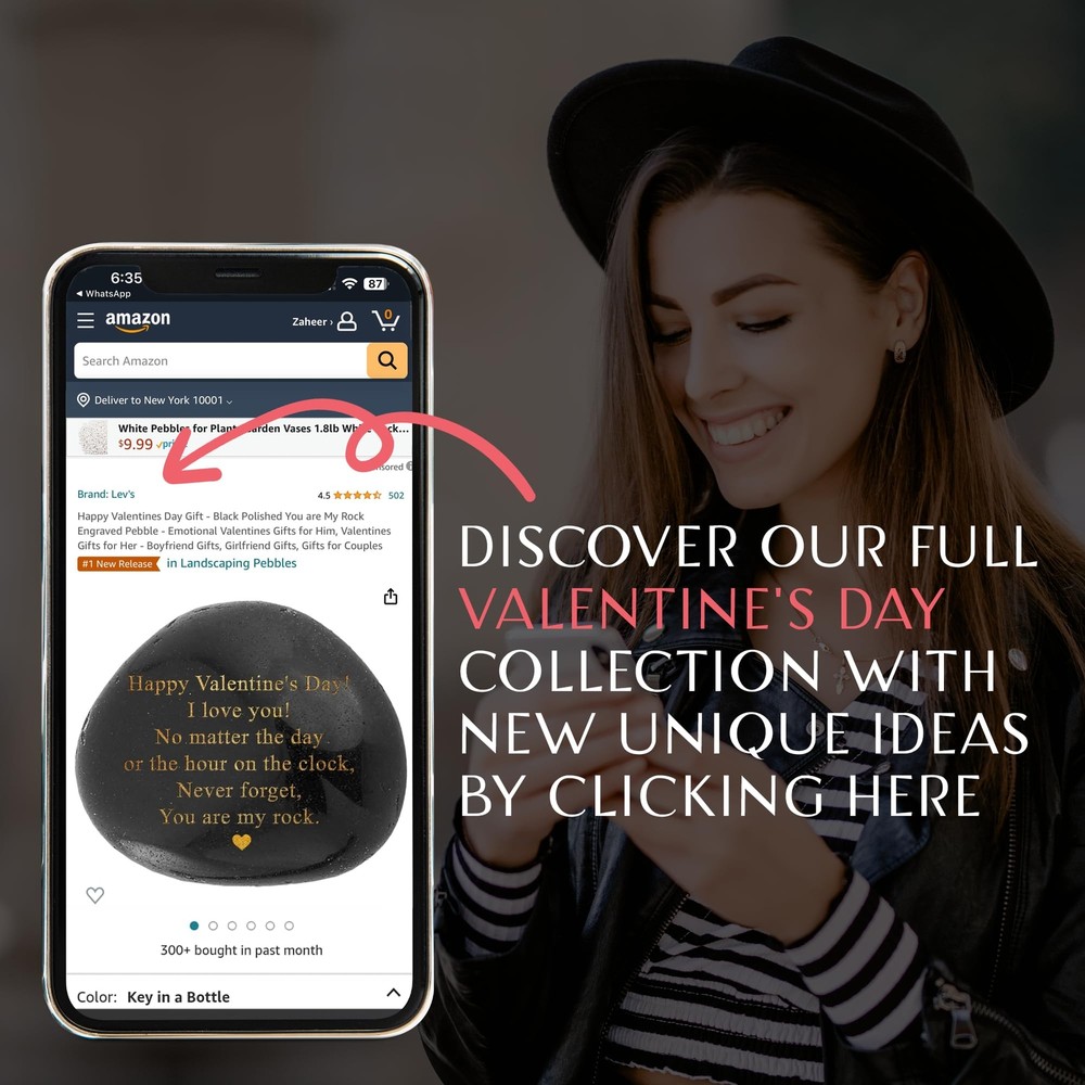 Do Not Buy A Valentine’s Gift Before You Read This! Whether you are on the lookout for gifts for fiance, gifts for husband from wife, or girlfriend gifts, you can’t go wrong with this Happy Valentine’s gift. Introducing A One-Of-A-Kind Valentine’s Gift Rock By VELENTI! If you’ve had enough of flimsy Valentines small gifts, dull Valentines gifts for boys or girls, and expensive Valentines ideas, you are in the right place. VELENTI offers a unique gift for him or her that will impress. Why Choose Our I Love You Gift? Here Are The Top 3 Reasons! ✅ REVEAL WHAT’S REALLY ON YOUR HEART: You've exchanged "I love yous" more times than you can count, but what if your sweetheart could be reminded of your love long after Valentine’s Day? The gold “You Are My Rock” message on this Valentine’s rock leaves no doubt about your heartfelt love! ✅ OFFER A LIFELONG GIFT: Unlike the fresh rose bouquet that dies within a week of its delivery, this hand-engraved rock is an eternal symbol of your relationship. It is made for meaningful shelf or table decoration and will be cherished by your sweetheart for years to come. ✅ SPOIL YOUR VALENTINE OR FRIEND: Show your warm feelings to your girlfriend, boyfriend, husband, wife, or best friend. This exquisite black pebble is not only an awesome gift for boys, girls, men, and women, but also a motivational friend gift. Need More Reasons? ✔ Inexpensive Gift Ideas For Women, Gifts For Men Who Have Everything ✔ Decorative Gifts For Teen Boys, Gifts For Teenage Girls ✔ Velvet Gift Pouch – Offer Your Valentine’s Gift Right Away! What You Get: 1 * Engraved Rock Valentine’s Gift 5 x 7 x 3cm, 120g Wait No More! Click “Add To Basket” NOW And Win Your Valentine Over! 🎁 Make Your Sweetheart's Heart Melt: Looking for romantic gifts for him or her? This sleek black pebble with the meaningful "You Are My Rock" message engraved with luxurious gold letters is your go-to Valentine's gift for women and men. 🎁 Cupid-Approved Valentine's Gift For Girlfriend, Boyfriend, Spouse: Tired of flower bear gifts, candy or card gifts for teens? This stunning engraved rock makes an original boyfriend gift, girlfriend, husband, or wife gift. 🎁 Offer A Gift That Will Last Forever: When February 14 comes, wow the special someone in your life with a Valentine’s Day gift that they'll cherish forever. Please note that our Happy Valentine's rock is natural, so its shape and size may slightly vary. 🎁 Show A Good Friend How Much They Mean: This beautiful Valentine's rock is not only a precious gift for him or her. It will also put your feelings for your best friend on display, making him/her feel the love on Valentine's Day and beyond. 🎁 Order Your Valentine's Gift With Confidence: We handpick our pebbles from hundreds of rocks by the riverside and use state-of-the-art printing methods and non-fade gold ink, to make sure that our Valentines Day gift will meet your highest standards.