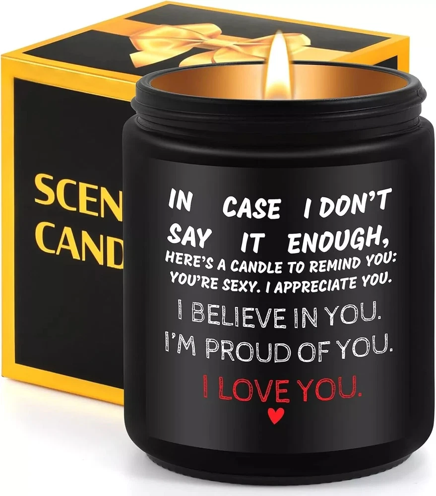 About this item: Expressive Romantic Candle Gift: Show your appreciation with a candle that says it all. Featuring the message “IN CASE I DON’T SAY IT ENOUGH, HERE’S A CANDLE TO REMIND YOU: YOU’RE SEXY. I APPRECIATE YOU. I BELIEVE IN YOU. I’M PROUD OF YOU. I LOVE YOU,” this is a sentimental gift for him and her and a perfect anniversary gift for couples. Ideal Engagement or Wedding Gift: This candle makes a thoughtful engagement gift for couple or wedding gift idea, ideal for celebrating relationship milestones with a lasting expression of love and support. Lavender Scented Candle for Relaxation: Infused with a soothing lavender aroma, this lavender scented candle is perfect for creating a relaxing, intimate atmosphere, making it an ideal romantic candle gift. Personalized Anniversary and Milestone Gift: Perfect for special occasions, this candle is a unique personalized anniversary gift and a funny couple gift that balances sentimentality and humor for meaningful gifting. Versatile for Any Occasion: Whether for an anniversary, birthday, or just because, this candle is a versatile choice. It’s a sentimental gift for him and her that celebrates love in an elegant, heartfelt way.