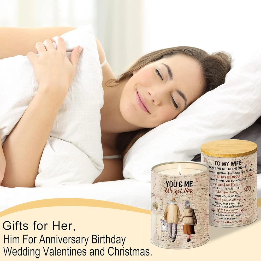 BEST GIFT IDEAS: To My Wife, when we get to the end of our lives together, the house we had. the cars we drove, the things we possessed won't matter. will matter, is that I had you and you had me. Thank you for always being there for me if I could turn back the clock I'd find you sooner and love you longer love, the one who needs you till the end! Such wonderful words, beautiful love, will bring tears to your wife's eyes., wife gifts from husband, gifts for wife. RELAXING GIFTS FOR HER: The candle is handmade with high quality natural soy wax and lavender fragrance oils, Burns with no soot or pungent odor and can burn for about 50 hours, The lavender scent is a no-fail, classic choice for stress relief, bath, yoga, etc. Wax can easily be cleaned out of the jar with hot soapy water and the jar can be reused or recycled MEANINGFUL GIFTS FOR WIFE: The Anniversary gift can be stand by itself, it is a good way to decorate the room or desktop, Melting special one's heart with the sweet message candle! Christmas gift for wife, Wife birthday gifts, wife birthday gifts from husband, wedding gifts for wife, birthday gift for wife, anniversary gift for wife, wife birthday gift ideas, birthday gifts for wife, wife birthday gift, Valentine's Day gift for wife, Mother's Day gift for wife. GIFTS FOR ANY OCCASION: This naughty candle is a birthday, anniversary, Christmas, Wedding, cheer up or naughty valentine's day gift for wife. Also a great graduation ceremony, touching, grateful, gift exchange, 20th, 25th anniversary gifts for wife. Perfect for your wife's 30th, 40th, 50th, 60th, 70th milestone birthdays, or any birthday in between. GIFT PACKAGING: Our Candle Boxes are beautifully designed with an elegant touch. Avoid the embarrassment of cheap looking gift boxes packed with tacky dollar store items(warm tips: this product is a single product)
