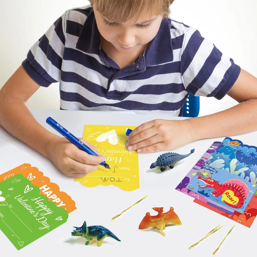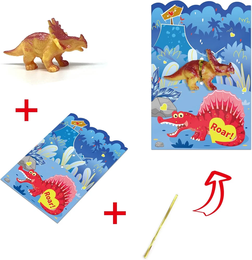 Valentine Gift Card Party Game Includes 24pcs toys with 24pcs cards, 2pcs for each of 12 Different toys. There are 4 dinosaur cards in each style and 6 dinosaur cards in different designs. Materials: made of high quality cardboard, it will not be easily damaged.No doubt it can be reused. Measurement: valentines paper dinosaurs cards measure 4”x 6”. A paper card large enough to hold more text.Let's play it. Easy to use: each card has the words "TO" and "FROM" on the back, as well as the dinosaurs on each card. Follow dashed lines to fold up the paper . Super fun game: perfect Valentine’s Day kids entertainment, excitement building, Valentine’s Day gifts, Valentine’s Day candy and toys, party gift supplies, novel gift toys, candy bag stuffing, Valentine’s Day treats for kids, Valentine’s Day Piñata stuffing, School classroom games, Valentine's Day party card games, classroom games, and family activities. Product Description Valentines Day Gift Cards Dinosaurs Toys for Kids 24pcs Animals Toy Greeting Cards for Valentine Happy Valentine's Day time, leave a good memory for children. Children's favorite dinosaur toy