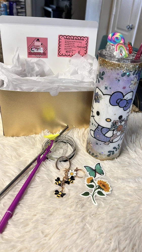 Tumbler comes with 1 regular slide lid. 1 recored lid 1 metal straw 1 reusable plastic straw 1 metal straw brush 1 cute flower pen 1 cute keychain This handmade seven-piece tumbler set is perfect for hello kitty fans. The glittery animal print design adds a touch of glam to this stainless steel and acrylic tumbler, which can hold up to 20 oz of your favorite hot or cold beverage. The slide lock lid ensures no spills while on-the-go. This tumbler set makes for a great Valentine's Day gift it’s made with FDA approved epoxy and glitter . It is recommended to hand wash only for care.