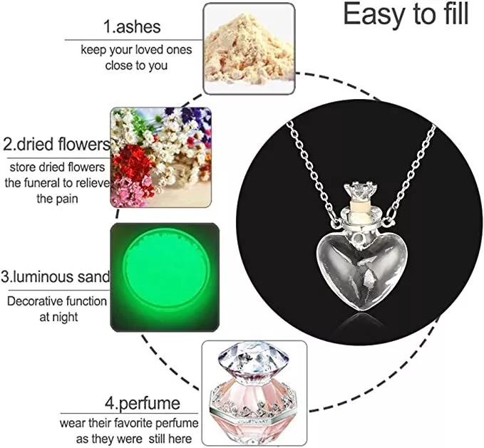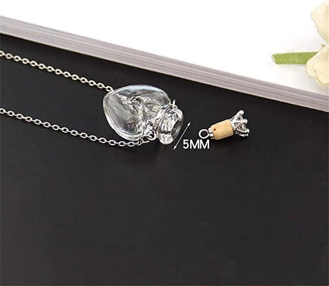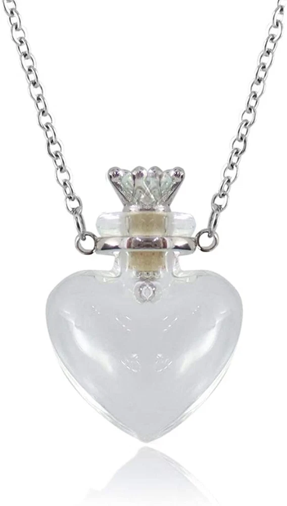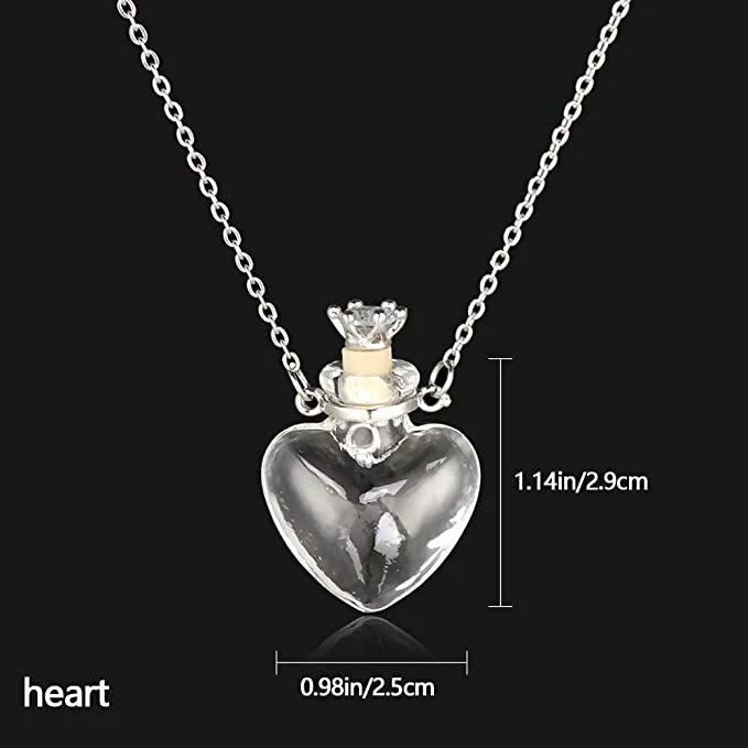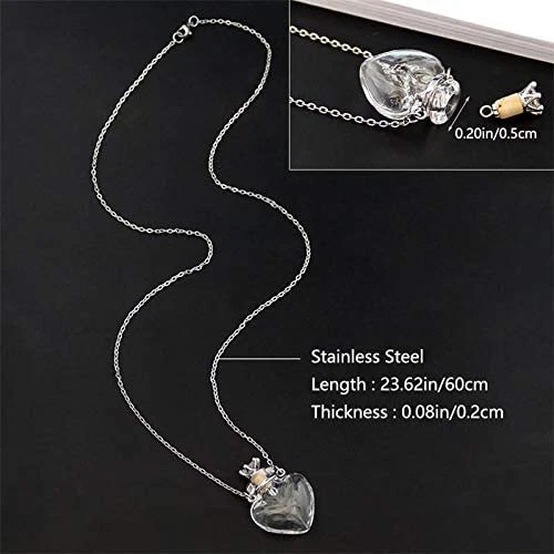 Valentines Day Gifts for Her-Clear Heart Vial Perfume Bottle Stainless Steel Necklaces Chain for Her,Mother's Day, Birthday, Anniversary, Christmas Gift Features Material- handmade lampwork Clear Glass bottle, cork Stopper, and stainless steel necklace chain Heart Bottle Size- 29MM(H)x25MM(W) ; Necklace Chain Length: 60CM Each necklace comes with 2 Stoppers- One is handmade Crown Cork Stopper,and the other is Spare beaded cork stopper. One Pipette is available to add your LIQUID- essential oil,perfume,fake blood,and many more possibilities! A small funnel is also available to fill your favorite Min Dry items- real dry flowers,Crystals,gemstones,beads,charms,beach sand,beach glass,hair,ashes,gold and silver flakes,small stones,mini origami,art rice,secret messages