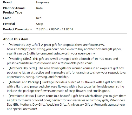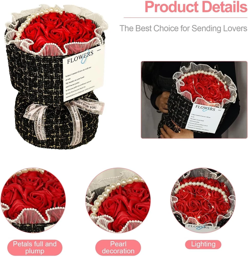 19 PCS Roses Bouquet Artificial Flower Preserved Soap Red Rose Flowers with Pearl Strings and Light for Her Unique Gift for Valentine's Day,Anniversary,Birthday,Mother's Day,Thanksgiving (Red) ️ Great quality~ Please see pictures for more details. You get what you see~~ will ship out within 24 hours, Via USPS priority shipping ~Please check out my listing for more amazing items. happy shopping 🥳 Note: This is open box item,, outside box is little bit broken. But inside is perfect~~ please message me if you have any question .