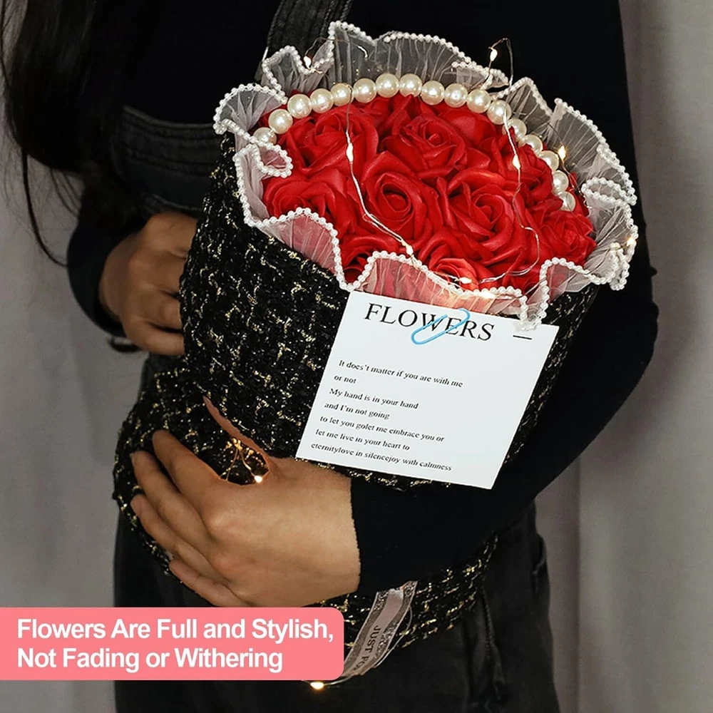 Valentines Day Gift For Her Red Roses Bouquet Artificial Flower,with Pearl+Light