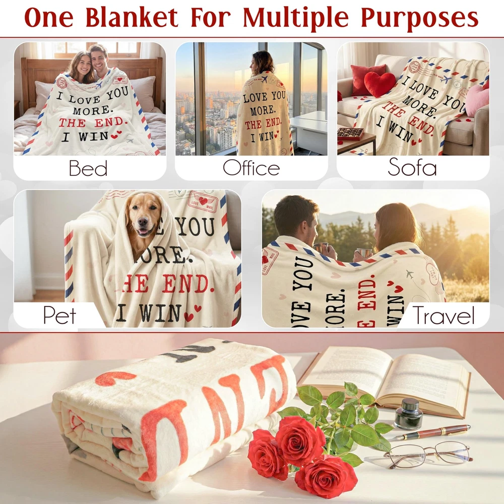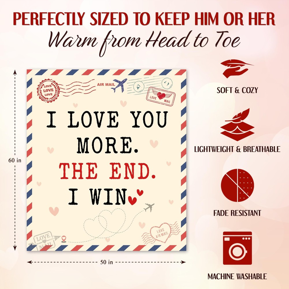 WRAPIX Valentines Day Gifts for Her Him - I Love You More 50x60 inches, I Win Product Details VALENTINES DAY GIFTS FOR MEN WOMEN - Infuse the warmth of love with our couple gifts for girlfriend boyfriend, wife birthday gift ideas, husband birthday gift. Enhance special moments with Valentines Day gifts for her, Valentines Day gifts for him, Valentines Day decorations, and thoughtful presents for mom, grandma or even lovely sisters gifts from sister. ANNIVERSARY GIFTS FOR COUPLE - Symbolize your everlasting bond with our exquisite anniversary gift for couple. These love blankets are the ultimate options for Valentines Day gifts, Valentines decor, romantic gifts for wife husband, unique girlfriend boyfriend gifts, and anniversary wedding gifts for couple. Wrap yourselves in love and celebrate every moment together! GIFTS BEYOND OCCASIONS - Celebrate any special moment with our lovely valentines day decor and couple gift ideas. From Valentines decorations, anniversary, engagement, wedding gifts to birthday gifts for women and men, this love blanket is designed to captivate hearts and delight your significant other. Let this warmth make every moment unforgettable. CERTIFIED QUALITY MATERIAL - Cozy together in this ultra-soft premium polyester with 280 gsm fabric and luxuriously soft fleece lining. Ideal for cuddling on movie nights or chilly evenings by the firepit. Non-toxic, hypoallergenic, and skin-friendly for your beloved one. Perfect for romantic couple gifts. Suitable for beds, sofas, and couches. SIMPLE CARE, EVERLASTING BLISS - Crafted with your convenience in mind, our love blanket is designed to withstand many standard washing machines. Makes a wonderful gift set for any special occasion. Simply machine wash on a gentle cycle using cold water, then tumble dry at a very low temperature. Not easy to shrink, shred, or fade.