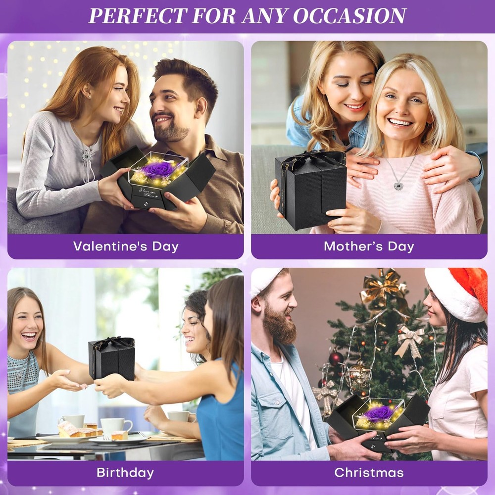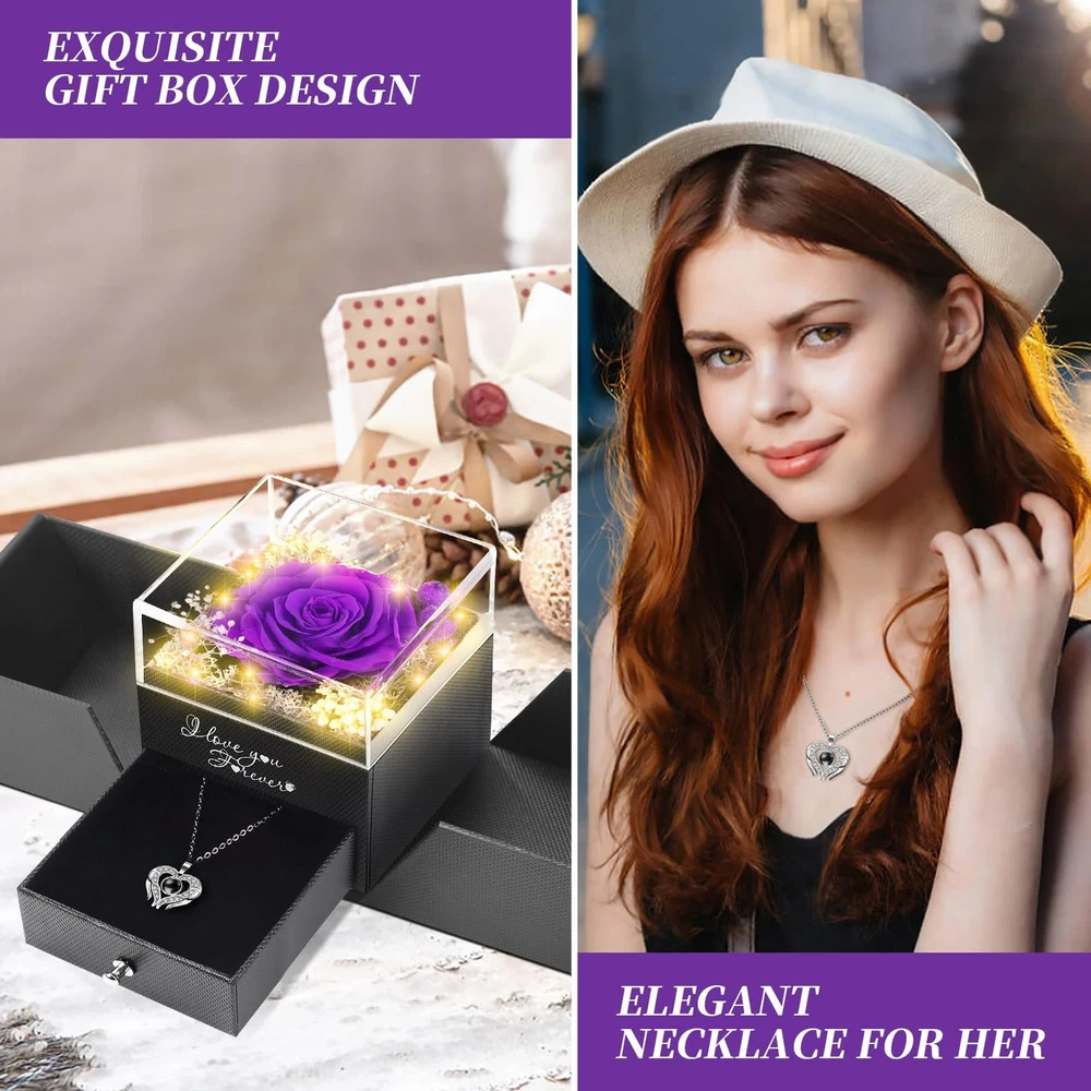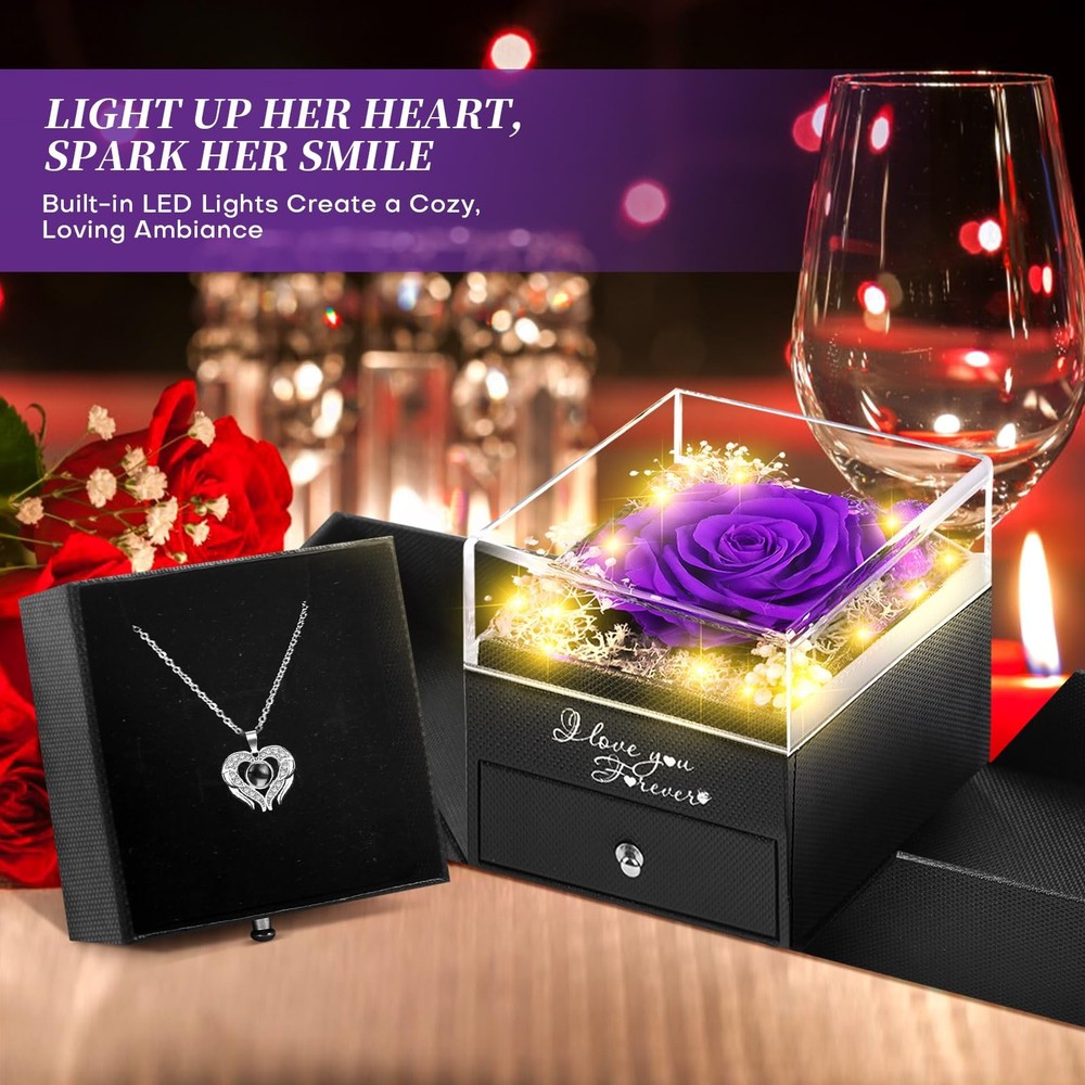 WOKEISE Lighted Preserved Real Rose Flowers with I Love You With Lid, Purple Product Details 【Rose Gifts for Women】This preserved purple rose is crafted from 100% real natural flowers, uniquely preserved to last for 3-5 years with no maintenance required. It never wilts, offering everlasting beauty as a symbol of eternal love. The rose is an ideal gift for your mom, wife, or girlfriend on Valentine's Day, anniversaries, birthdays, mothers day gifts for mom or any special occasion. No need for watering, making it a hassle-free way to express your love. A perfect choice for mothers day gifts, Valentine's Day gifts for her, gifts for girlfriend, and forever flowers 【Enchanting LED Light Display】The preserved rose is enhanced with soft LED lights, creating a warm and romantic ambiance that elevates its charm and sophistication. The LED light adds a magical glow, making it perfect for Valentine's Day gifts for her, gifts for girlfriend, or Mother's Day gifts. Whether used as a nightlight or decorative piece, it brings elegance to any room and makes an unforgettable impression. An excellent choice for forever flowers and gifts for women 【Necklace with "I LOVE YOU" in 100 different languages】Inside the rose box, you'll find a unique double heart-shaped necklace engraved with "I LOVE YOU" in 100 different languages. This symbolizes deep affection and makes it an unforgettable gift. The necklace is the perfect expression of love, ideal for gifts for wife, anniversary gifts for women, and gifts for women who appreciate meaningful, romantic surprises. The beautifully designed box and necklace will touch her heart in every way 【Ready to Gift with Elegant Packaging】No need to worry about wrapping or presentation—this preserved rose and necklace come beautifully packaged in an elegant gift box, perfect for giving directly to your loved one. The luxurious design allows the box to be reused as a jewelry holder, while the rose serves as a stunning indoor ornament. It's a fantastic anniversary gift for her or birthday gifts for women. This complete gift set includes 1 preserved red rose, 1 double heart necklace with "I LOVE YOU" in 100 languages, a gift box, greeting card, and gift bag 【Perfect for Special Occasions】Looking for birthday gifts for women or gifts for mom? This exquisite preserved rose and necklace set makes an unforgettable surprise for any occasion, such as Valentine's Day gifts, Mother's Day, Christmas, anniversaries, or as a thoughtful girlfriend gift. The vibrant red rose is a beautiful reminder of your love, while the heartfelt necklace can be worn daily, always reminding her of your special bond