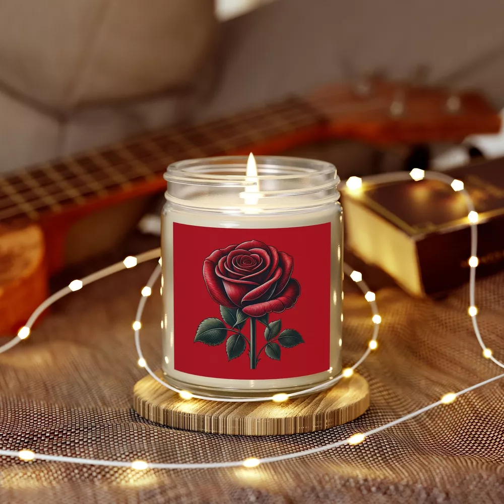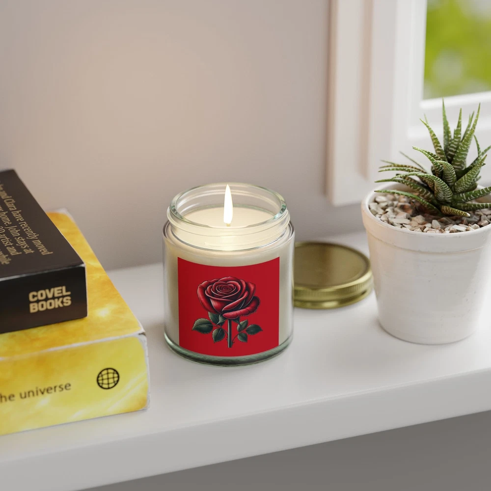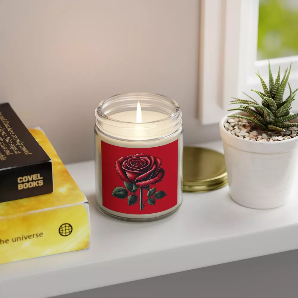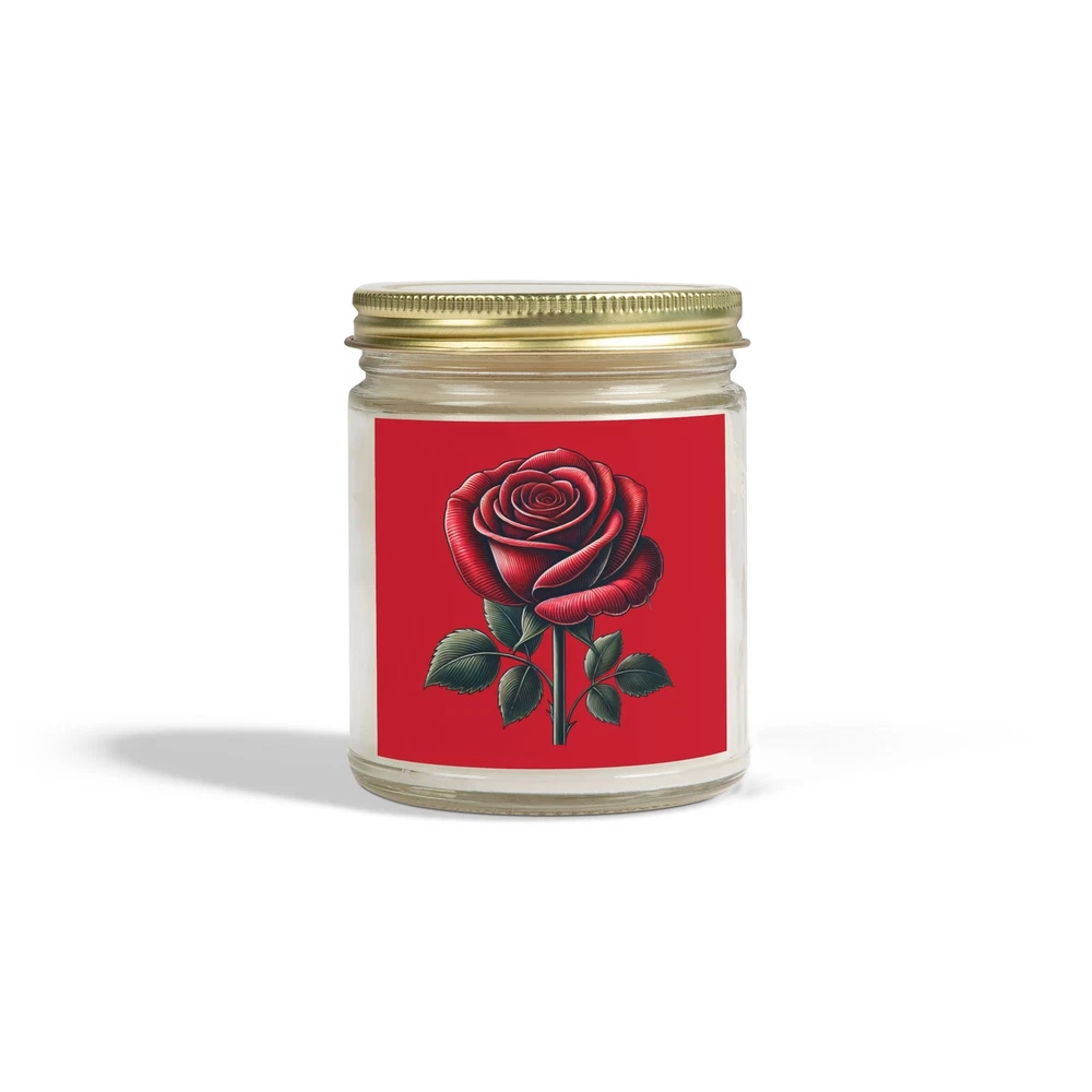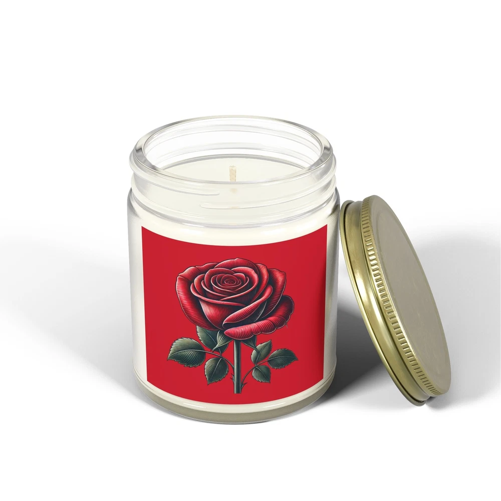 Add a touch of romance to your Valentines Day gift with this elegant candle with a beautifully detailed red rose design. A thoughtful and unique way to show your love! These scented candles are hand-poured in the USA, and made from premium coconut apricot wax with cotton wicks that are lead and zinc-free. With a burn time of approximately 20 hours, they provide long-lasting fragrance and warmth. The candles come in 9 scents, topped with a stylish gold lid, making them a beautiful, ambient addition to any space. .: Materials: coconut apricot wax, cotton wick .: Lid color: gold .: Vessel color: amber and clear .: Burn time: up to 20 hours (4oz), up to 50 hours (9oz) .: Compliant with ASTM safety standards .: Assembled in the USA from globally sourced parts .: Please note: All scents have the same natural color