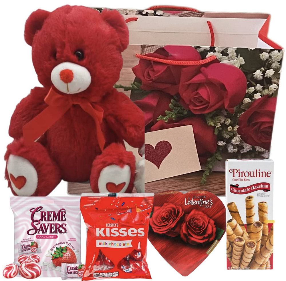 TEDDY BEAR PLUSH - This adorable TEDDY BEAR Sits at 10" inches of huggable, loveable stuffed animal. Complete with a ribbon on his neck, the best way to say I LOVE YOU to the ones you love, during VALENTINE’s Day. (ASSORTED COLORS (White, or Red,) CREME SAVERS HARD CANDY - Iconic Candy, Individually Wrapped- Mess free individually wrapped fruit-flavored hard candy will keep each delicious piece fresh until it's time for a new bag. Take it Anywhere - Great on the go candy to share with family and friends! Makes the perfect treat for office pantry, candy dish, & Valentine's Day. Iconic Nostalgic Candy is Back - Enjoy the candy you grew up on with this all in one bulk candy pack! The hard candies have been reformulated and remastered to bring back those flavors you knew so well! HERSHEY'S KISSES - Candies have you covered. These milk chocolate classics make the perfect creamy treat throughout the day. ELMER HEART SHAPED CHOCOLATE - Classically packaged, delicious, assorted chocolates! These heart-shaped boxes of candy are an iconic way to express your love on special occasions. Perfect for Valentine's Day gifts, classroom Valentine’s parties, and office treats. Assortments may vary. PIROULINE (DARK CHOCOLATE OR HAZELNUT) WAFERS - Pirouline Crème Filled Wafers the best-selling rolled wafer flavor in America. Chocolate Hazelnut Crème is the perfect balance of classic milk chocolate with a hint of hazelnut flavor. Dark Chocolate Crème delivers darker chocolate flavor and this wafer is the perfect dessert companion for any event. When you are looking for something sweet, crispy, and indulgent, grab the wafers with the Signature Swirl. VALENTINE GIFT BAG - Give your loved one a special little something in the Sweet Valentine's Day Gift Bag. Well decorated bag and it's a totally cute way to carry a present, on Valentine's Day make everyday moments more beautiful and celebrations more joyful... You will receive 6 items: 1 Teddy Bear Plush (COLOR WILL VARY Red or White), 1 Creme Savers Hard Candy, 1 Hershey's Kisses Milk Chocolate, 1 Pirouline Wafers Hazelnut or Dark Chocolate, 1 Heart- Shaped Elmer Chocolate, and 1 Beautiful Valentine Bags (Design will Vary)