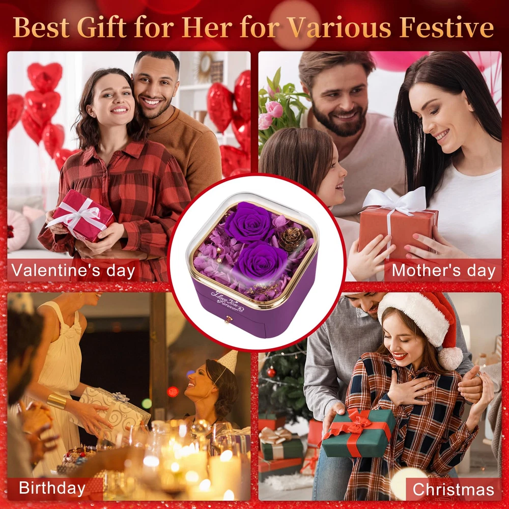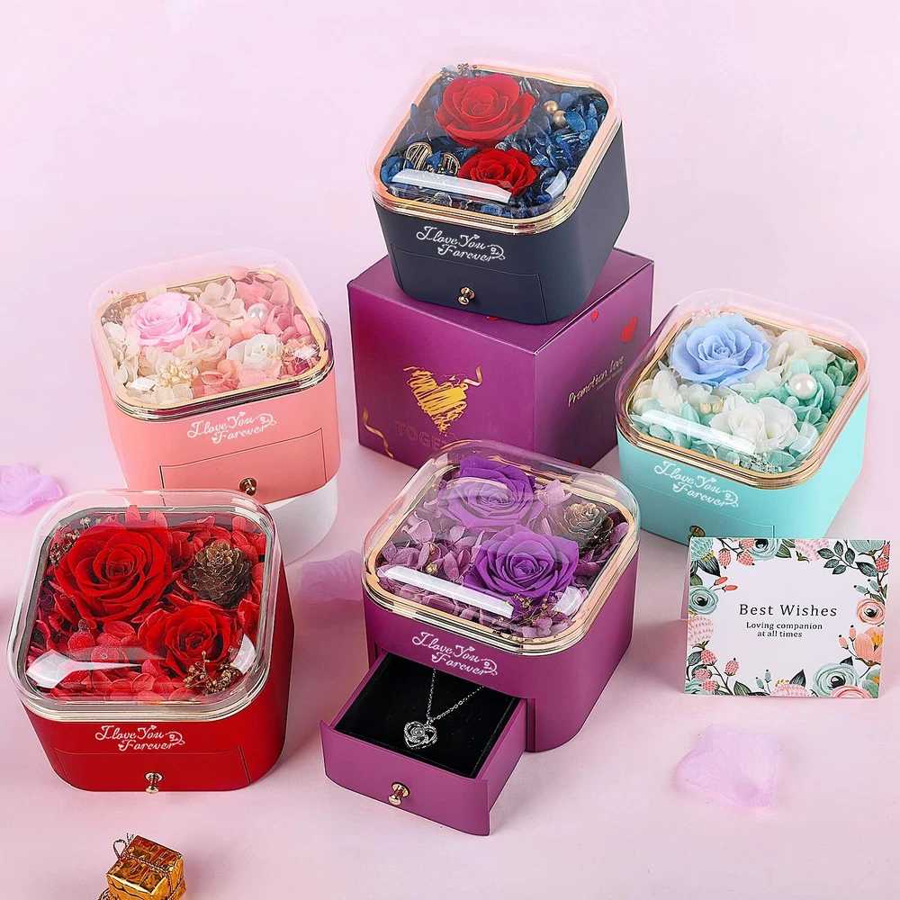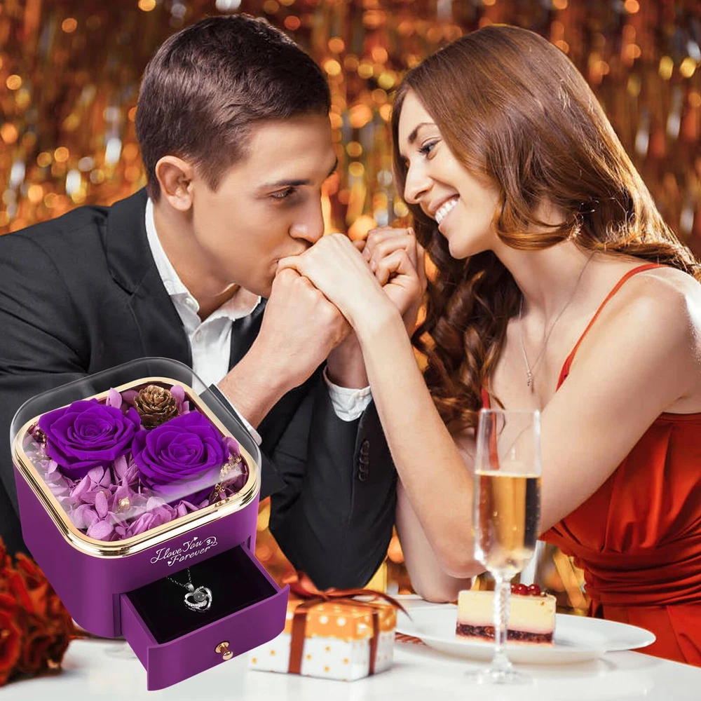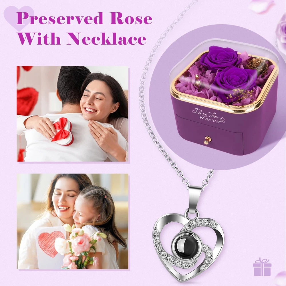 Gifts for Women - Preserved Rose: Preserved flowers gift is a perfect Mothers Day,Valentines Day and Birthday gifts for women, on behalf of eternal love.Keeps your love fresh and eternal, Eternal flower, forever love, best Mothers day gifts for mom. Rose Flower Gifts for Her -Eternal flower: Preserved real rose is made of 100% real nature fresh flowers, After a unique preservation method, it will stay for 3-5 years. No pollen. No need to water, no maintenance required. Package -1 Preserved Eternal Rose + 1 Gift Box + 1 Heart Necklace with I Love You Necklace in 100 Languages) + 1 Greeting Card. Perfect Gift for Occasion: Prefect Preserved Real Rose with Necklace The Most Romantic Surprise Gifts for Mom, Wife, Girlfriend, Mother, Daughter, Grandma.Rose Flower Gift for Her, Birthday Gifts for Women, Anniversary Gifts for Women.A Creative Gifts for Valentines Day, Mothers Day, Christmas, Anniversary and Birthday. Jewel Case- Heart Necklace: Unique heart-shaped structure and is engraved with " I LOVE YOU necklace 100 Languages " to express love to her. It can also store other jewelry or rings. How to See the I Love You in 100 Languages: In a well-lit environment , bring the stone in the middle of the necklace close to your eyes .Or go to a dark area with little to no light , turn on the camera function of the phone and point the camera at the stone .You will see 100 languages on the screen.