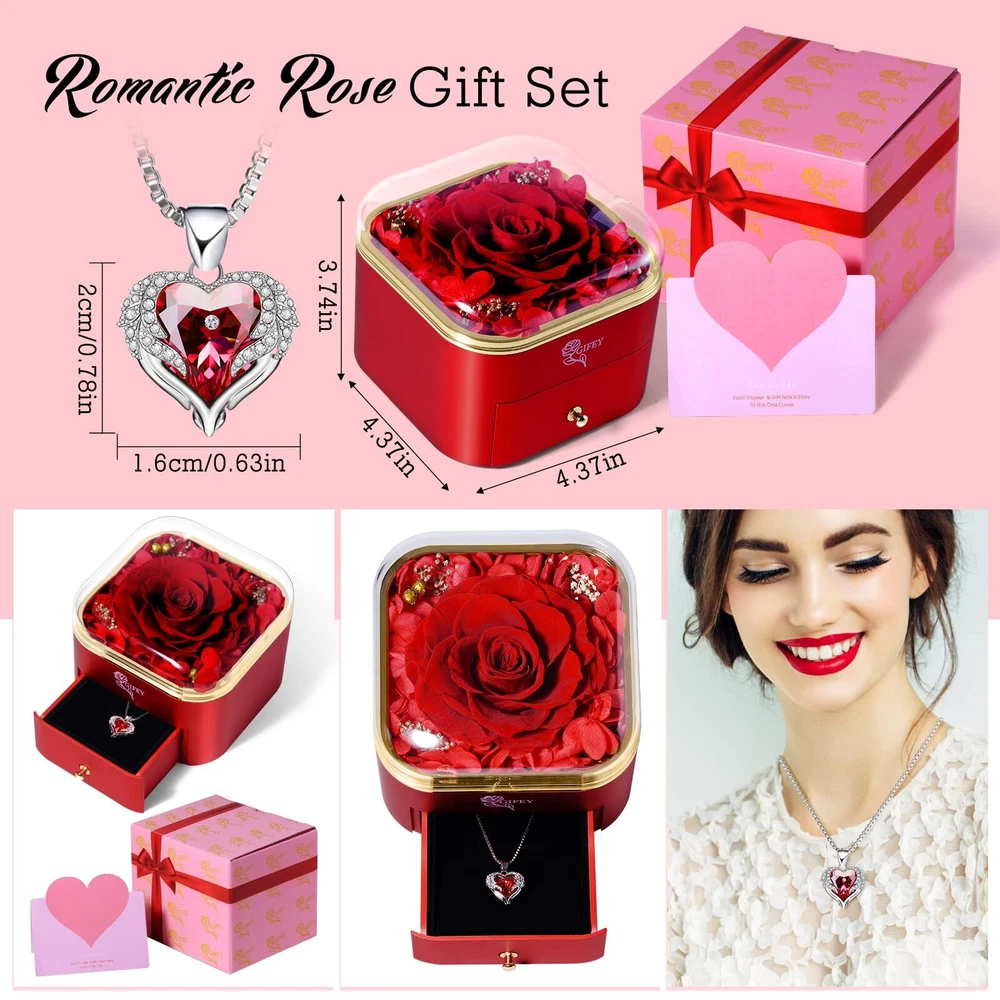 Valentine Day Gifts for Her :Preserved Roses are well wrapped in the gift box with a greeting card, so that you could give directly without spend time on package. As an exquisite luxury gift, it can also store other jewelry. The necklace can be worn, and the rose box can be placed indoors as an ornament, Your lover will feel happy every day looking at it. Preserved Real Rose: Preserved real rose are made of 100% real fresh roses. After a unique preservation method, our roses can keep the appearance of flowers for 3-5 years, without watering and management. Preserved real rose with necklace is a creative gift for Valentine’s Day, Anniversary,Mother's day and Birthday. I Love You Gifts for Her ,Angel Wings Heart Necklace: classical angel wings-shaped design with shining heart Austrian birthstone crystal. symbolizes eternal love, spirituality and protection.Valentines Day gifts for her, Mom gifts for her birthday, red rose gifts for her, Valentines romantic gifts for her. Valentine's Love Gift Ideas,Romantic Gifts for Her :Surprise your loved ones with a stunning forever flower and a shining crystal pendant that will keep the memories alive for years to come. gifts for her, gifts for mom, gifts for girlfriend, girlfriend gifts, cool gifts,gifts for grandma, gifts for wife,gifts for sister and so much more! choose the color they'll love most for their next gift! Great Gift for Her:Eternal rose means eternal love, this product will be the best gift for her. Your anniversary can be romantic and an unforgettable memory.Lovely Gifts for Wife, Mom,Girlfriend, Fiancée,Grandma ,Sister,as Valentine's Day, Mother's Day, Christmas, Thanksgiving, Wedding, Anniversary, Birthday or other Holiday Gifts for Women.