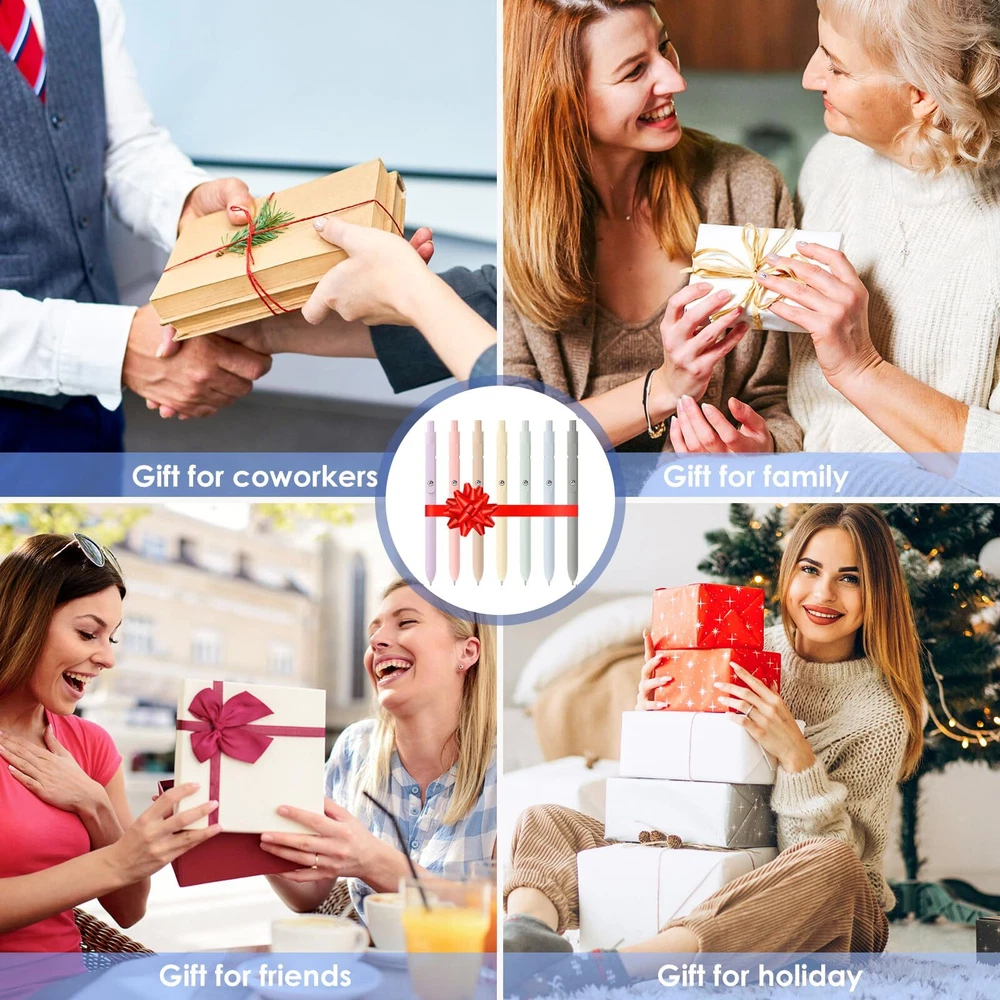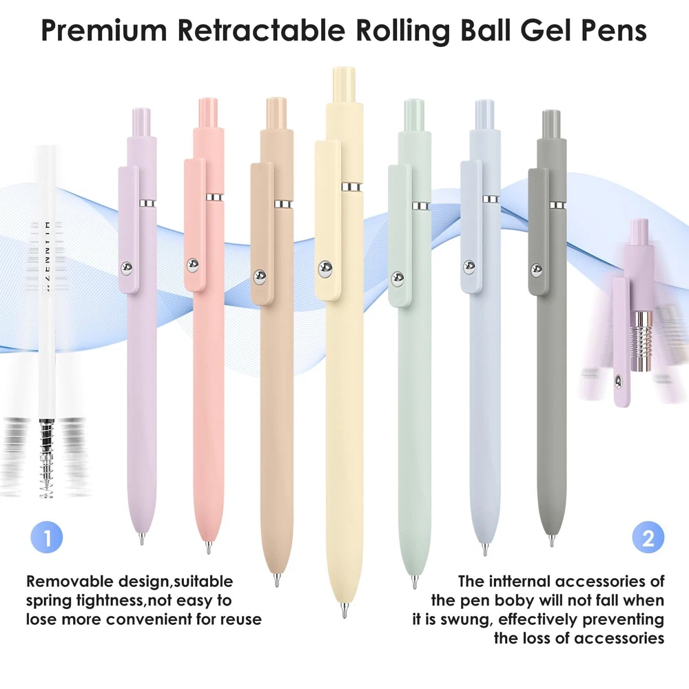 Retractable Gel Pens, Gel Ink Rollerball Pens, Multifunction Writing Instruments, 7 Pcs Japanese Black Ink Pens Fine Point Smooth Writing Pens, Quick Drying for Journaling Note Taking School Office Desk Accessories 【Quick Drying Ink Pens】Say goodbye to any unwanted smudges or wait for the ink to dry. Experience the convenience of quick-drying ink of these journal pens, with no leaks, no smears, no smudges, and no globs, they flow smoothly and deliver vivid black ink, keeping pages clean and neat. Ideal for left & right-handed writing, drawing, and taking quick notes on the go, as they won't fade, bleed, or smudge, you don't need to wait for the ink to dry before moving your hand across the paper. 【Awesome Gifts For Men Women】Crafted with a fine point 0.5mm black ink roller ball, these pens offer precise lines and create detailed writing. Whether you're planning, sketching, doodling, scrapbooking, writing, drawing, or coloring projects, these gel pens provide excellent control over your strokes. Perfect for men, women, and kids in the classroom, school, and office, making it a great stocking stuffer, party favor, birthday, anniversary, Halloween, Thanksgiving, Christmas, Valentine's Day. 【Personalised Gifts for Men Women】Multifunction writing instruments feature fine point tips and offer a consistent flow of ink, which means you enjoy a smooth and precise writing experience with our gel pens, ideal for note-taking, journaling, and diary writing. The rolling ball design ensures effortless gliding on paper and gives you no bleed and non-skip writing. The rich ultra-black ink makes your handwriting beautiful and clear, perfect for detailed artwork, coloring, writing, and more. 【Birthday Gifts for Men Women】With the retractable design, you can easily click the pen cap, and the tip will extend or retract automatically, preventing ink from accidentally staining your belongings, books, or pockets. The sleek, stylish barrel gives the pen a modern, professional look. The soft silicone grip brings a soft touch feeling which makes each gel pen comfortable to hold for long writing without sore, making it a good tool for works, back-to-school supplies, college and preppy stuff 【Stocking Stuffer for Men Women】A pack of 7pcs gel ink pens means a reliable writing tool that is sure to last, and each pen is sealed with wax to prevent ink from drying. Also, the little steel ball on the clip is very entertaining to spin. You can attach them to notebooks, binders, pockets, and planners with durable clips, which are convenient to carry and prevent loss. Whether you're a student, or professional, these cute gel ink pens are ideal for all your writing needs and everyday tasks.