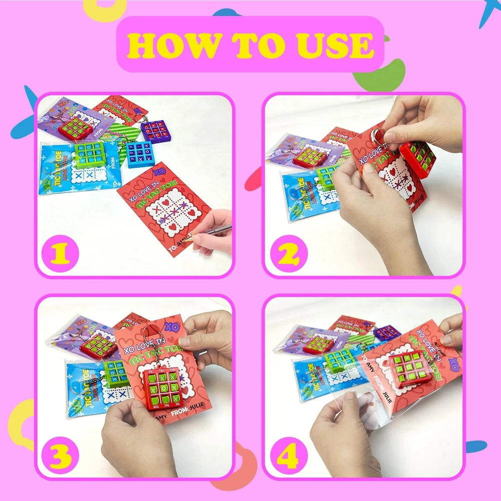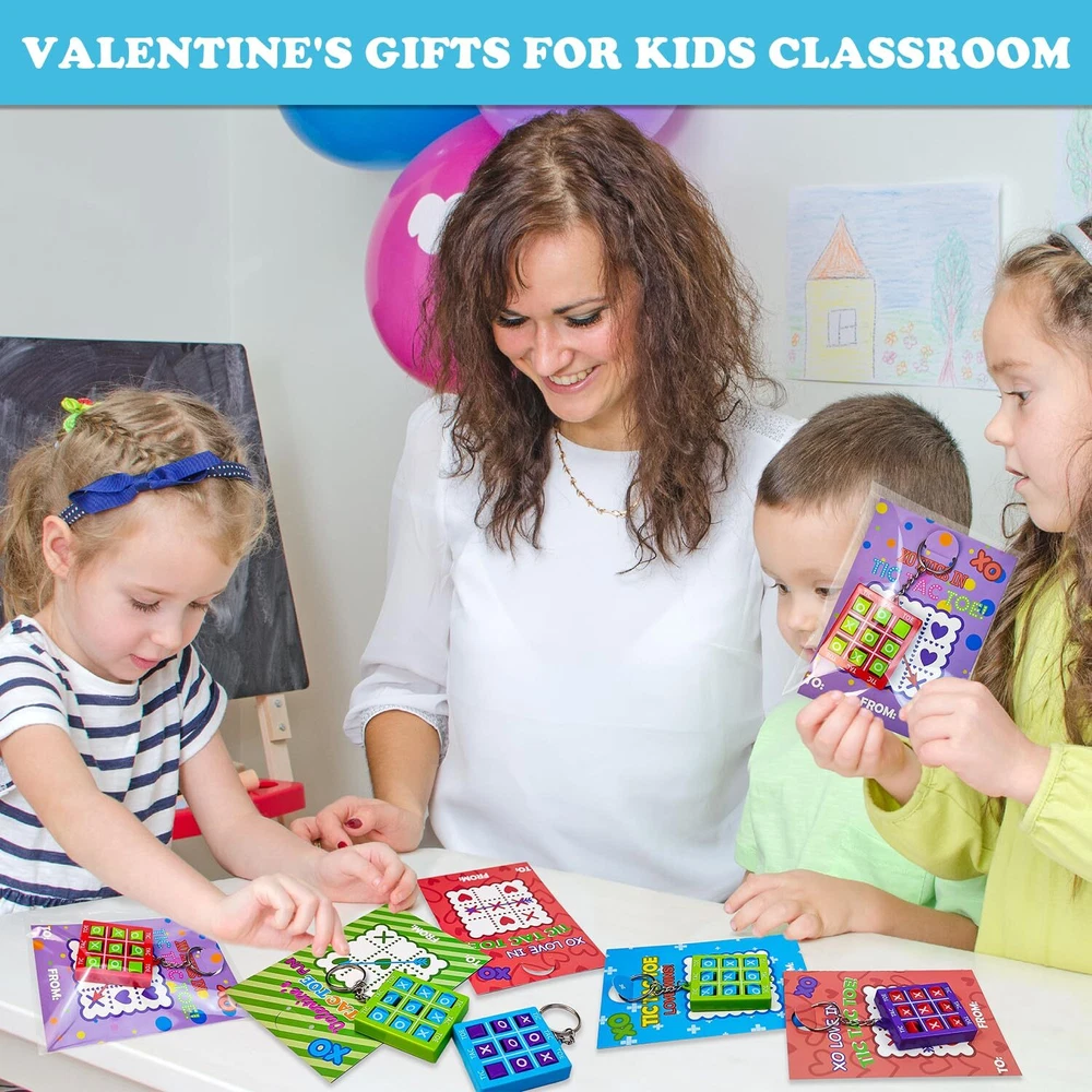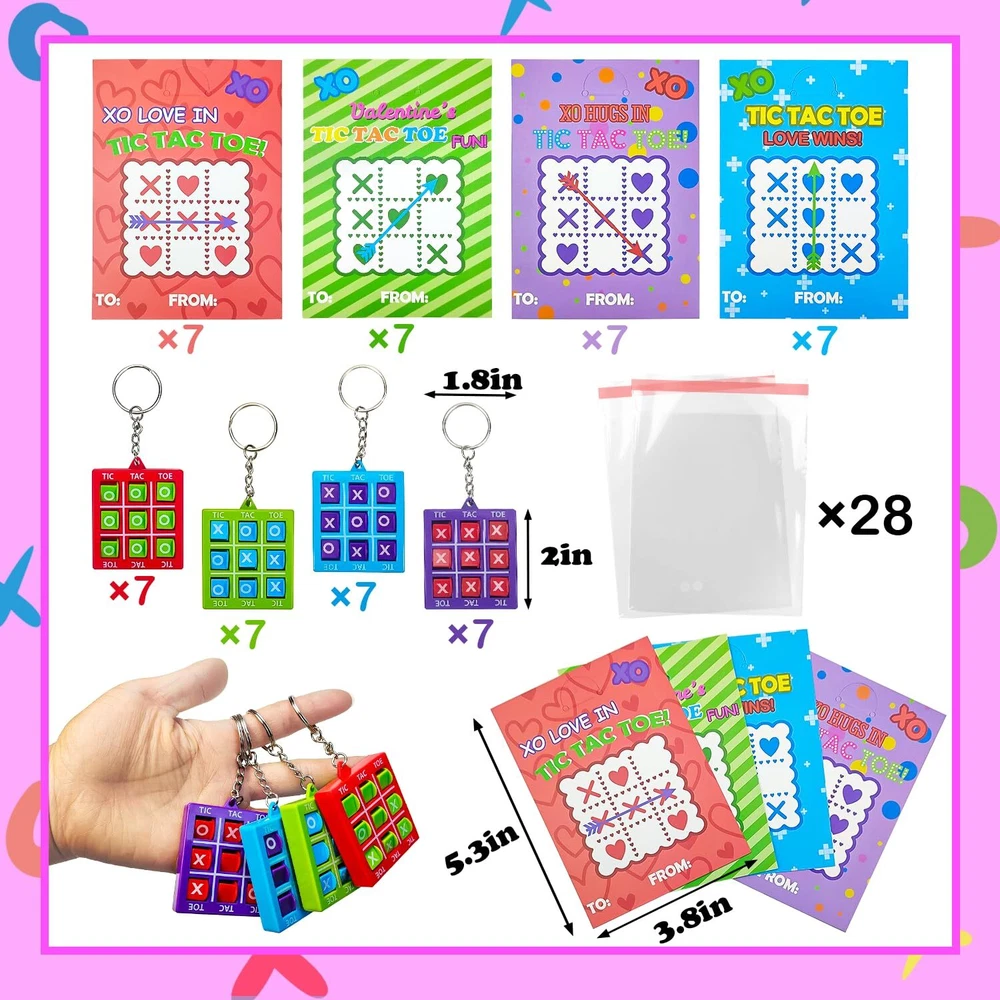 28-Pack Tic Tac Toe game with Cards - This set features 28 Tic Tac Toe keychains paired with greeting cards, providing a personal touch with the option to write names on them. Valentine's Classroom Gifts for Kids - Ideal for exchanging heartfelt Valentine's Day gifts in the classroom, perfect for your children to share with their classmates on the special day. Valentine's Party Favors - Exceptional and enjoyable additions to goodie bags, as well as fantastic prizes and non candy treats for kids' school parties or birthdays. Portable Fun on the Go - Crafted from robust plastic, our lightweight and portable Tic-Tac-Toe keychains guarantee durability and on-the-go entertainment. Easily attach them to any clip on your kid's pouch or backpack for endless enjoyment! Fun for Everyone, Anytime – Perfect for kids in 3rd, 4th, and 5th grades, toddlers, boys, girls, teens, and even adults who enjoy playful moments.