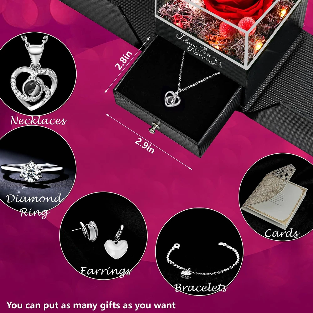 【Valentines Day Gifts for Her】1 Preserved Eternal Rose made of 100% real nature fresh flowers, 1 Gift Box, 5 color breathing light, 1 Gift Bag, 1 Greeting Card, 1 Double Heart Necklace (With I Love You Necklace in 100 Languages) . 【Easy Maintenance】Forever rose after a unique preservation method, it will stay for 3-5 years. No pollen, no need to water, no maintenance required, as a perfect anniversary and birthday gift for her, on behalf of eternal love. 【More than Unique Necklace】Unique double heart-shaped structure and is engraved with " I LOVE YOU necklace 100 Languages " to express love to her. The necklace on hidden inside bottom of the rose box, and you can DIY gifts by replacing necklaces with earrings, rings, bracelets, gift ideas for women for every romantic occasion. 【The Most Romantic Gifts for Women】The most romantic Surprise Gifts for Mom, Wife, Girlfriend, Daughter, on Mothers day, Valentine's Day, Christmas, Thanksgiving, anniversary gift for her, New Year's Day gifts for her or other holiday occasions gift ideas for women, gifts for wife who have everything, the red rose flower will never wither and die. 【Buy at Ease】Our mother's day glass rose with necklace gifts set can be used as birthday gifts for girlfriend, if there is any problem with our product, don’t hesitate to contact us as soon as possible. We will do our best to satisfy you! Mothers day gifts for mom from son husband daughter.