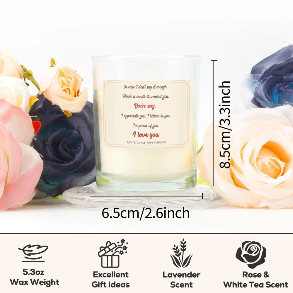 Valentines Day Gifts for Her Couples Gift Ideas Girlfriend Gifts for Wife Birthday Scented Candles Valentines Gifts for Girlfriend Gifts Girlfriend Birthday Gifts for Couple Christmas Gifts for Her Welcome to MY STORE No Extra Charge Flat Rate Shipping 24/7 Support Always Able to Help eBay Payment We Accept eBay Payments Method Fast Delivery We Process & Deliver on Time Valentines Day Gifts for Her Couples Gift Ideas Girlfriend Gifts for Wife Birthday Scented Candles Valentines Gifts for Girlfriend Gifts Girlfriend Birthday Gifts for Couple Christmas Gifts for Her Product Description Product Features Funny Gifts for Her or Him: In case I don't say it enough. Here's a candle to remind you: You're sexy. I appreciate you. I believe in you. I'm proud of you. I love you. This uniquely designed candle is only a beautiful accent to a room, but also a delightful way to show your appreciation. girlfriend gifts, birthday gifts for girlfriend, cool girlfriend birthday gifts, christmas stocking stuffers for girlfriend, wife birthday gift ideas, wife gifts, valentines gifts for her. Premium Soya Candle: This aromatherapy candle is handmade with premium soya wax and natural essential oils, safe to use. Each one contains 150 grams/5.3 ounces of candle, which means it will last for over 24 hours. This relaxing aromatherapy candle can be used by family and friends, perfect for home or office use, the glass jar is recyclable and environmentally friendly. When the candle is finished, the jar can be reused as a vase, pen holder, decoration and more. Aroma of Rose White Tea Aromatherapy: When lit the scent emits the aroma of Rose White Tea, which will permeate the room, relaxing while spreading love and warmth into your home. It will help you fall asleep faster and relieve stress and fatigue. Meanwhile, to add a sense of ambience, you can use it for activities such as reading, yoga, bathing, exercise, aromatherapy, family gatherings, spas and appointments. Great Gift Ideas: This scented candle is an excellent gift choice for Dad, Mom, Grandpa, Grandma, Uncle, Aunt, Boyfriend, Girlfriend,Wife,Husband,Brother, Sister, Friends, Colleagues, Nurses, Girlfriends, Bosses or anyone else.Can be used as an anniversary gift, holiday gift, Halloween gift, Thanksgiving gift, Christmas gift, new home gift,wedding gift,sobriety gift,new job gift for women in office, boss gift, housewarming gift, or any other special day gift, it's a gift idea for any occasion! Trustworthy Customer Service: Our scented candles come with a box that eliminates the need to purchase separate gift wrap or boxes. Our unique candle gifts are both practical and stylish. If you encounter any problems during the purchase process, you can come to contact us. We will help you to solve it. Hope you have a happy shopping! Shipping We do not ship to a different address. We will ship to the address you provide on eBay only. Please check your address before purchase. Fast shipping is very important for us. It should take 3-5 business days for the product to reach your destination. If it takes any longer than that, please do not hesitate to contact us to resolve the issues. Returns All our products come with a 30-Day Return Policy. If you would like to return your item and you are within 30 days of the purchase If you are not 100% satisfied, please let us know the Detailed Problem,We will give you a 100% satisfactory solution. If you received an incorrect, damaged, defective, or item not as described, contact us for a partial/full refund or replacement on our cost. Free Shipping and Free Return 30-Days Money Back Guarantee. Payment We accept eBay payments such as PayPal, Google Pay, Visa, MasterCard, and American Express. Payment is processed through eBay's secure system. Please ensure that your shipping address is correct before making the payment, as we are unable to change it after the order is processed. For any payment-related issues, please contact eBay customer support. Feedback Your feedback is very important to us. After you receive your package and are satisfied with our service, please leave us positive feedback. If you have any problem with your order or any questions, please contact us before leaving any type of feedback. Contact Us If you have any questions related to our products, please don't hesitate to contact us through eBay message.