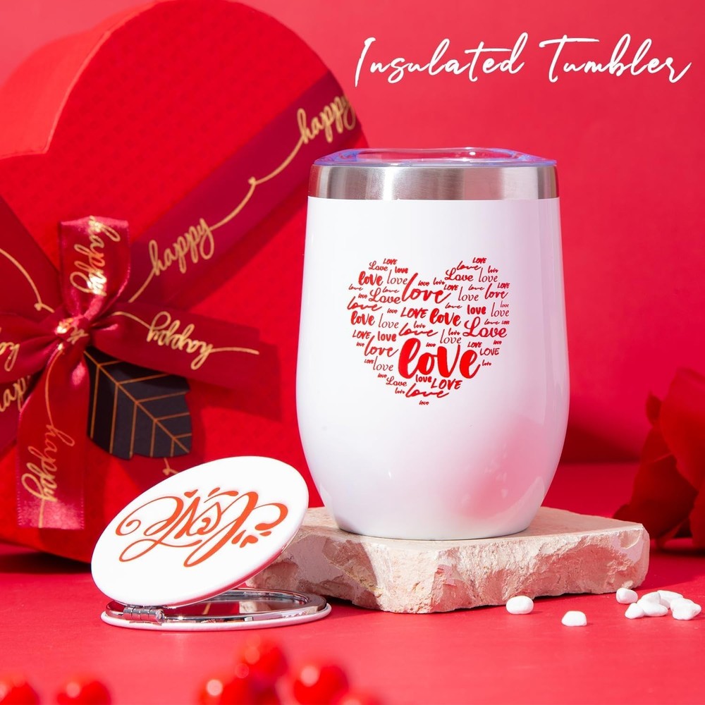 About this item 🎁The Beautifully Packaged Gift Box Includes:1 x 12 oz Insulated stainless steel tumbler ,1 x Mirror ,1 x Bath sea salt ,1 x Love Heart Wood Pieces ,1 x Gift box,1 x Greeting card, 1 x Heart shaped Bath bomb,A bouquet of dried soap rose. 💐Everlasting LOVE: Rose is a symbol of fine, best wishes, forever love, passionate and romantics. Give your wife, girlfriend, best friend, romantic gift. 👍Natural & Safe Materials:12 oz insulated stainless steel tumbler is made of 304 Grade - 18/8 stainless steel with a BPA free push-seal lid,It will keep hot/cold for up to 3 hours. 💖Bath and Relaxation : Indulge in relaxation with bath essentials like bath salts, and bath bombs from this set. They create an enchanting bathing experience, helping her unwind and enjoy some well-deserved self-care. 🎁 Cute Love Gifts: Enchanting Love gift is a cute and unique present for your Wife, girlfriend, sister on special occasions such as Mothers Day,Valentine's Day ,Birthday,Wedding & Engagement or Anniversaries.