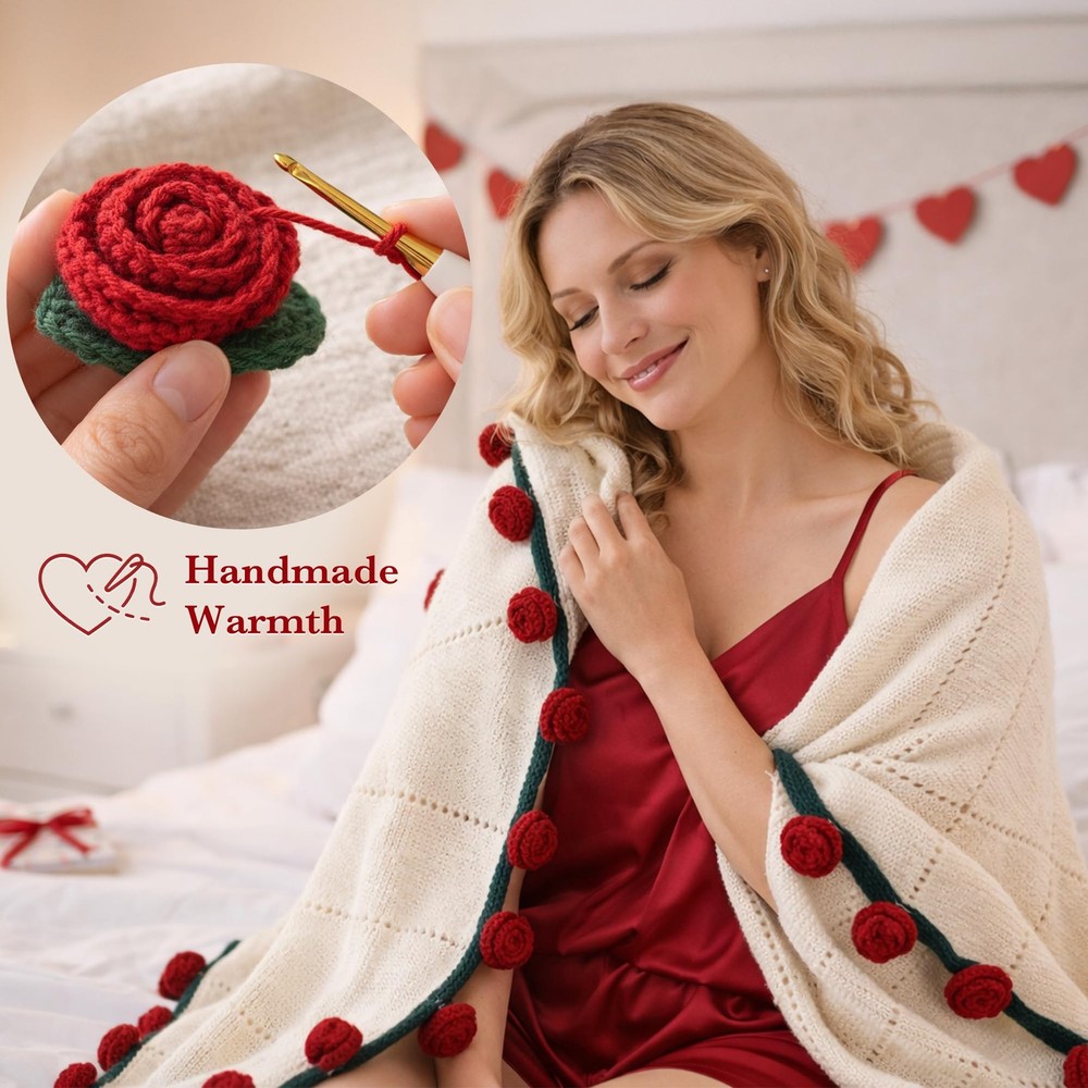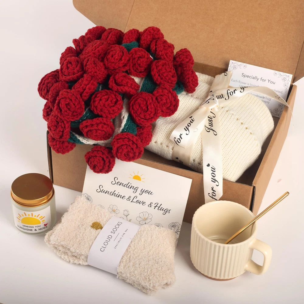 Brighten her day with a gift that feels personal, comforting, and truly unforgettable. This exquisite gift is thoughtfully curated to bring warmth, relaxation, and joy to the special in your life. At the heart of the set is our unique crochet flower bouquet blanket—an innovative 2-in-1 design that rolls into a beautiful everlasting rose bouquet and unrolls into a soft, cozy throw perfect for snuggling on the couch, relaxing during -care moments, or adding a charming touch to home décor. Paired with a soothing aromatherapy soy candle, a beautifully crafted ceramic mug, and ultra-soft fuzzy socks, this gift set creates a calming sanctuary she can enjoy anytime. Whether she needs encouragement, comfort, or simply a moment to unwind, this care package delivers a warm “I’m thinking of you” in the most heartfelt way. Perfect for well soon gifts for , -care gifts, gifts, sympathy gifts, Valentines Day gifts for her, anniversary surprises, Mother’s Day, or thoughtful thinking of you gifts, this luxury is ready to delight and uplift the woman who deserves love and attention. Beautifully packaged and ready to give, it’s an elegant way to make your wife, girlfriend, mom, sister, or best friend feel cherished, appreciated, and deeply loved. ROMANTIC ROSE BLANKET GIFT SET FOR HER: Looking for a meaningful romantic gift that speaks from the heart? This red rose crochet bouquet blanket gift set is designed to express love, passion, and devotion. More than flowers, it’s a lasting symbol of your feelings—perfect for anniversaries, birthdays, Valentine’s Day, or any moment you want to remind her how deeply she’s loved. ANNIVERSARY & GIFTS FOR GIRLFRIEND OR WIFE: Unlike ordinary gifts, this rose bouquet blanket rolls into a stunning floral arrangement and unfolds into a cozy throw she can use every day. A thoughtful anniversary gift for your wife, a romantic gift for your girlfriend, or a heartfelt surprise that turns everyday comfort into a reminder of your love. LUXURIOUS ROMANTIC GIFT WITH LOVE IN EVERY DETAIL: This elegant gift set includes a Crochet Rose Bouquet Throw Blanket, Ceramic Mug, Aromatherapy Soy Candle, Ultra-Soft Cozy Socks, a Premium Gift Card, and a beautifully designed gift . Every is carefully chosen to create a warm, intimate, and romantic experience she’ll treasure. A ROMANTIC COMFORT SHE’LL ENJOY EVERY DAY: More than a decorative bouquet, this rose blanket becomes part of her daily life—wrapped around her on the couch, draped over the bed, or used during quiet evenings at home. Every time she uses it, she’s reminded of your love, turning simple moments into meaningful memories. ELEGANTLY PACKAGED & READY TO IMPRESS: Arrives in a beautifully arranged luxury gift , ready to give with no extra wrapping needed. A perfect romantic gift for anniversaries, birthdays, Valentine’s Day, or just because. Designed to create unforgettable moments and express love in the most comforting, heartfelt way.