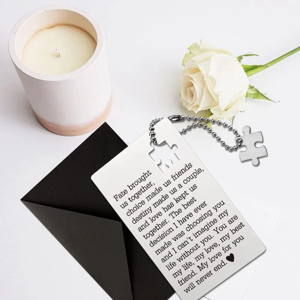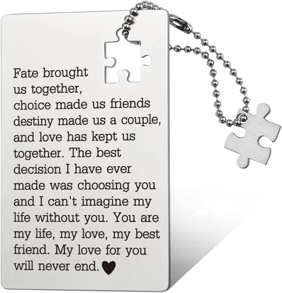 llxxeyopqdxz Husband Birthday Card From Wife, Wallet Insert Card, Anniversary Valentine Gifts for Men or Women, Love Gift for Him, Her, Boyfriend, Girlfriend, Birthday Gifts for Wife Husband About this item Anniversary gifts: Preserve the uniqueness of your relationship with a Stainless steel wallet card mini love note. Perfect for Anniversary Gifts, Birthday Gifts, Wedding Day Gifts, Christmas Gifts, Valentine's Day Gifts and more. Card Size: The length and width of the card is about 3.35 * 2.17inches and the thickness is about 0.04inches High quality material: Made of stainless steel; No Rust; No Allergy; No Fading; No Deformation; Super Sturdy materia Mini love note: This wallet card is permanently etched, the words of the wallet inserts are as shown in the picture, the words will last for a lifetime! Our promise: We pays great attentions to the shopping experiences from the customers, your satisfaction is the motivation for us to move forward. We will do our best to solve any problems and provide you with the best customer services. Item specifics Brand llxxeyopqdxz Item Weight 1.13 ounces Product Dimensions 3.35 x 2.17 x 0.01 inches Item model number 1 Color Metallic primary color Pre-printed Fate brought us together, love keeps us together. Happy Anniversary! Number of Items 1 Size 1 Count (Pack of 1)