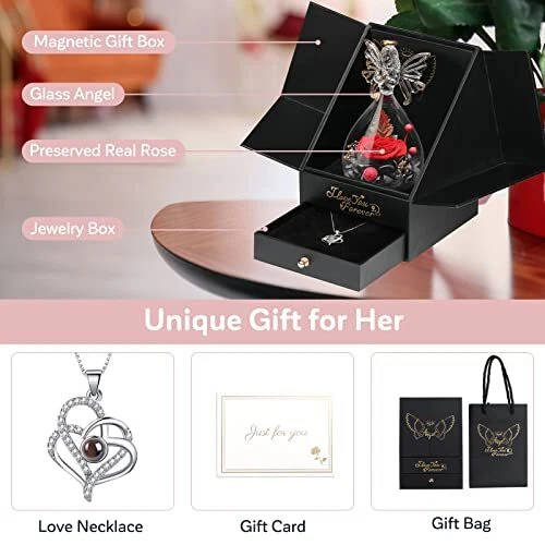 30 Days Return Policy Fast Delivery Trusted seller Valentine's Day Gifts for Her Gifts for Women-Preserved Flower Real Rose I Love You Necklace 100 Languages-Glass Angel Figurine-Eternal Flowers for Women Mom Birthday Gift Ideas Unique Product Description Glass Angel, Preserved Real Rose ??【Glass Angel Gifts for Women】 Surprise her with our Angel Rose Gift, featuring an angelic figure crafted from crystal clear glass symbolizing goodness, good luck, happiness, kindness and integrity. Encased within is a preserved rose, a symbol of eternal love that transcends time, promising eternal beauty and a bond unbroken. Ideal for expressing heartfelt wishes and blessings, it's a masterpiece of purity and elegance. Wonderful women’s gifts, Mothers Day gifts, anniversary gifts for women, I Love You Gifts for her. ??【Preserved Real Rose as Birthday Gifts for Women】The preserved flowers cultivated from real fresh roses and undergoing a unique preservation process, these roses maintain their allure for up to 5 years. A symbol of enduring beauty and commitment, it’s the perfect ode to the women who illuminate your life and makes her feel cherished on her special day. Unique angel gifts for women her, best friend gifts, sister gifts, daughters gifts, mom birthday gifts, grandma birthday gifts. ??【I Love You Necklace in 100 Languages】Express love in 100 different languages with our enchanting I Love You Necklace, using innovative projection technology, uniting hearts worldwide. The double heart pendant, a beacon of mutual affection, projects your heartfelt message in myriad tongues. Speak volumes of your deep affection, making it the ultimate anniversay gift for the special women in your life. ??【Romantic Christmas gifts for Her on Any Occasion】This preserved rose in glass angel gift is an emblem of love's enduring grace, it's a beacon of love and warmth, perfect for celebrating the myriad of special moments that life offers—Valentine’s day, Mother's Day, birthday, anniversary, Thanksgiving, wedding, but also as get well gifts for women to make her feel better! The angel figurine is an exquisite and impressive decor for home, room, wedding, family party. ??【Unique Christmas gifts Gift】It’s a tribute to the timeless love of mothers, this memorable piece combines a preserved rose, a heartfelt necklace, and a glass angel, encapsulating your everlasting love and admiration for her. Cradled within a guardian angel of glass, they speak of an eternal promise, a keepsake of love’s everlasting flame, lighting up lives with its undiminished glow. ??【Angel's Embrace Gift Set】Presenting a meticulously curated Beautiful Value Gift Package that captures the essence of affection and admiration. This set includes a glass angel, a preserved real rose, an I love you necklace, a magnetic gift box, a gift bag, a gift card. Designed to captivate at first glance with the elegantly packaged to make her feel truly special. Pamper and indulge the special lady in your life with a stunningly beautiful angel rose flower gift. Shipping Returns Payment Shipping Shipping is FREE to all addresses other than APO/PO boxes in the lower 48 states. All our stock ships from US-based warehouses. Shipped via USPS or UPS (depending on location and package weight) Unless stated otherwise, all orders will ship within 24-72 hours of your payment being processed. Check our feedback to see the great reviews of FAST shipping we offer. Returns As our valued customer, we will do our best to make sure the product you receive arrives to you on time and as expected. If you are not satisfied with your purchase, please contact us within 30 days of receiving your order to process a return. Payment We currently accept payment via eBay managed payments only. Once payment is cleared, we will dispatch your shipment within 1-3 business days. Please refer to the "Shipping" tab for more information regarding shipping speed to your destination.