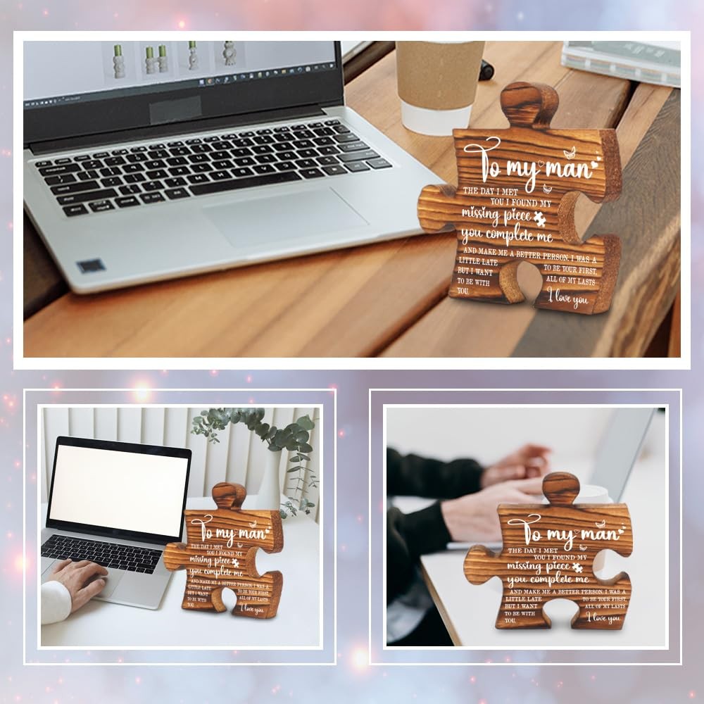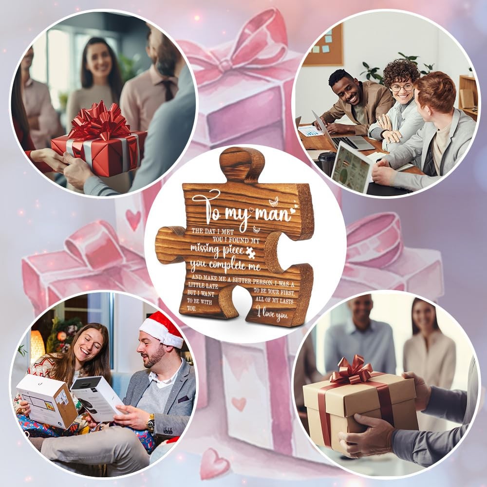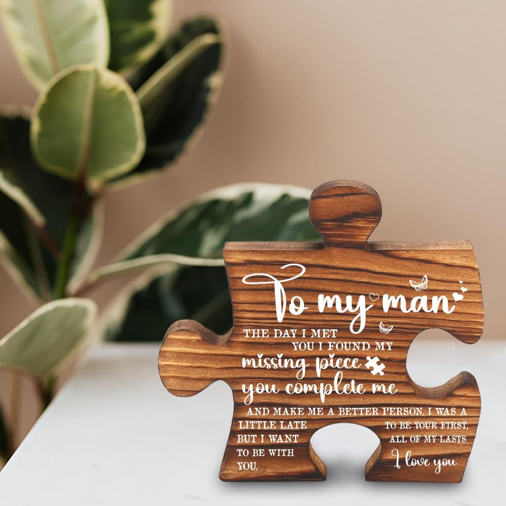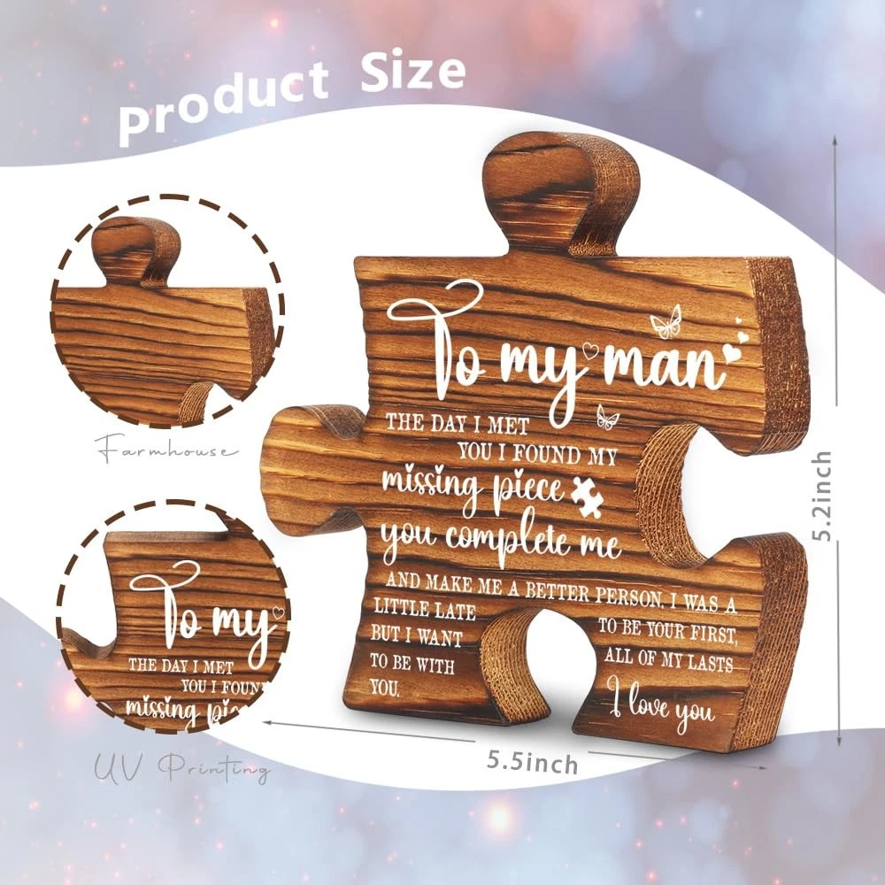 To My Man Puzzle Piece Gifts, Missing 5.5 x 5.1 inches, Retro colors Description Features: 【Puzzle Piece Design】Crafted in a unique puzzle shape from quality pine wood, featuring UV-printed heartfelt words and charming graphics, symbolizing the importance of each individual piece. 【Thank You & Appreciation Gifts】Thoughtfully designed for coworkers, mentors, employees, bosses, nurses, and volunteers. The warm and inspiring messages express genuine gratitude and encouragement. 【Premium Material】Made of durable pine wood with fine UV printing for a rustic yet elegant farmhouse style. 【Perfect Size】Measures approximately 14 × 13.2 cm (5.5 × 5.1 inches), ideal for desktop or shelf display without taking up much space. 【Versatile Occasions】A meaningful gift for team building, retirement parties, going-away celebrations, Thanksgiving, Christmas, and other special occasions, helping celebrate the difference each person makes. Product Details: Handling We will ship all orders within 1 business day of payment. Delivery We Do Not Ship Outside of the Continental US. Return Policy All items qualify for returns within 30 days of receipt. Buyer is responsible for return shipping on any item that is not damaged. Feedback We take our reputation seriously, we buy and sell online, so we understand the value of trust. If you are unsatisfied with your order, please contact us and we will work with you to resolve it to your satisfaction.