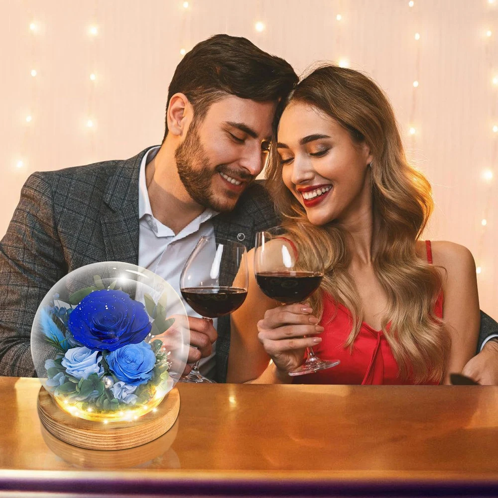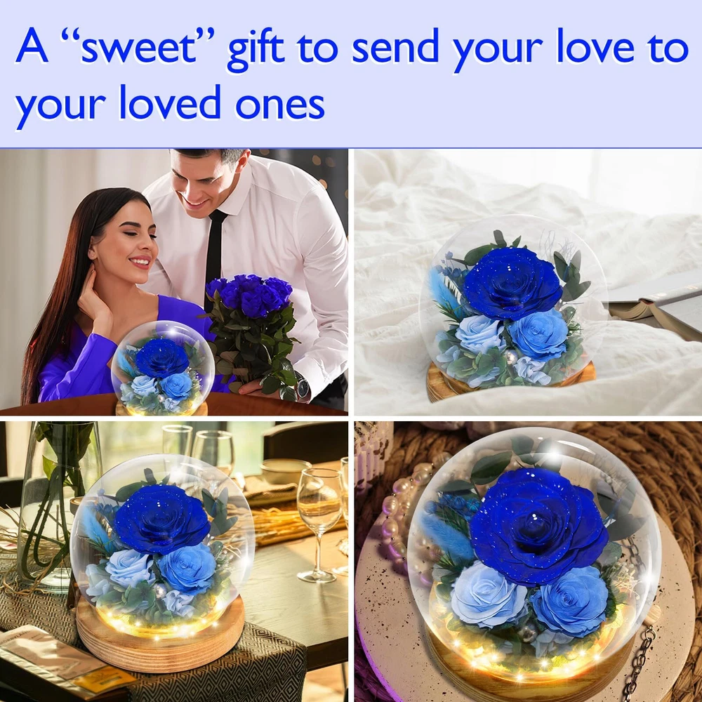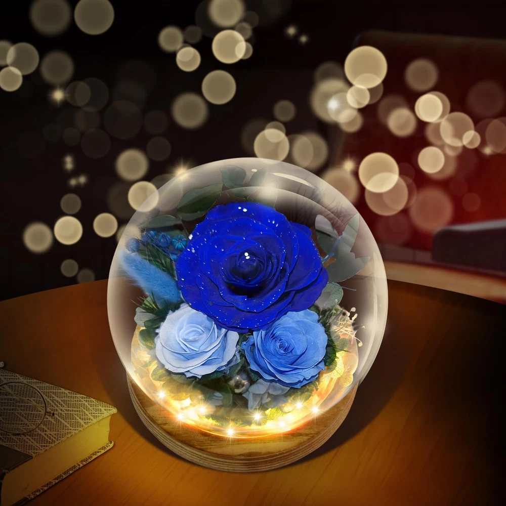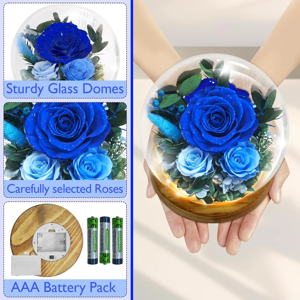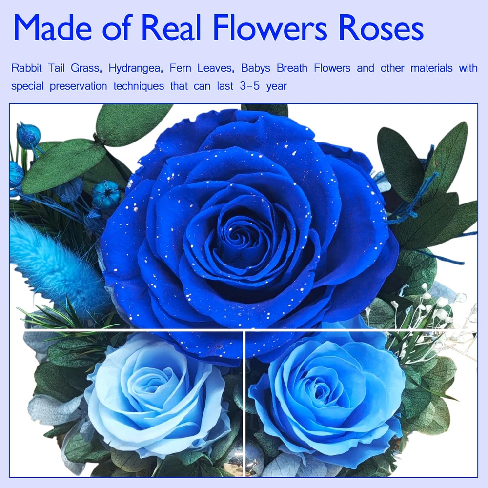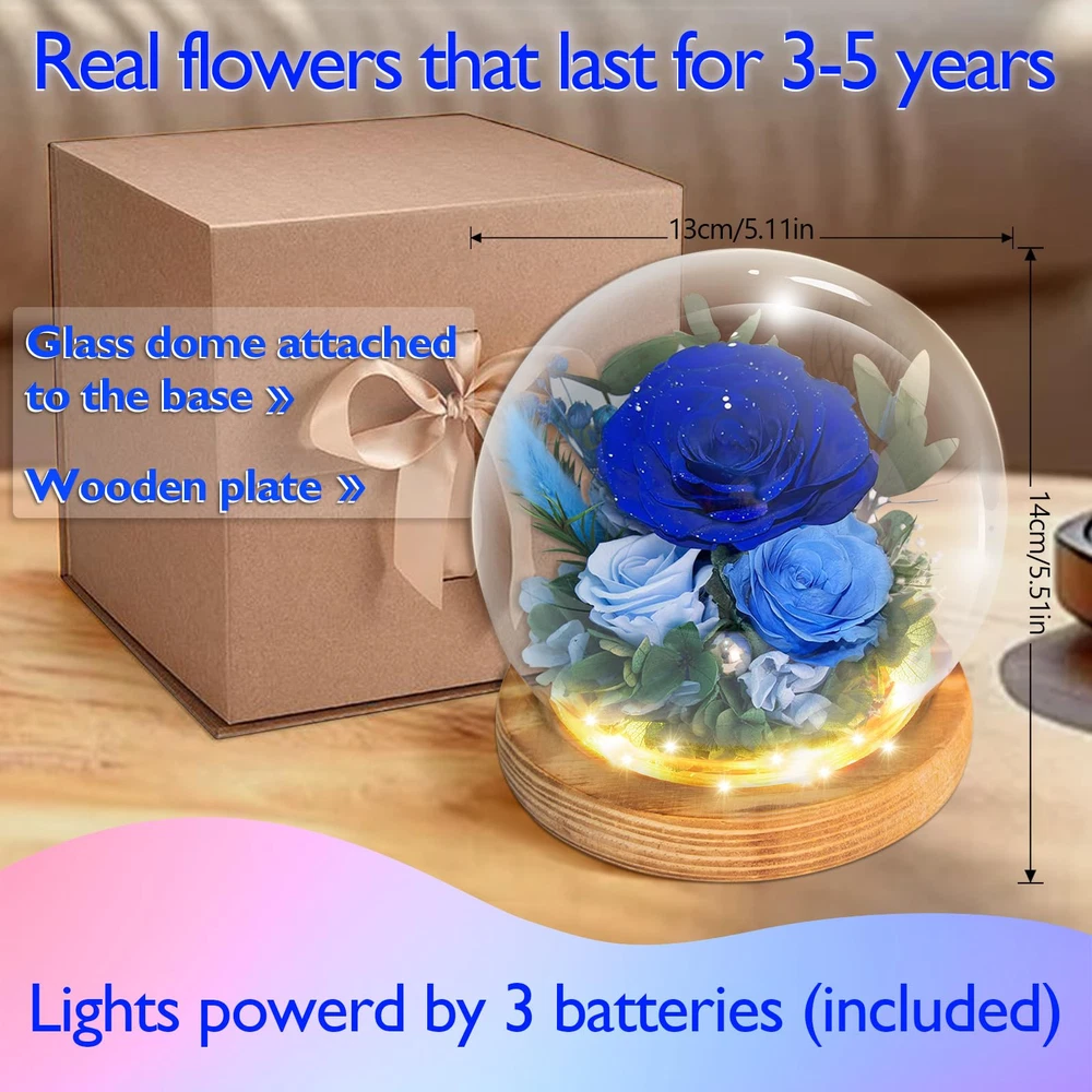 Timeless Beauty with Real Flowers: Include 3 preserved real blue roses, delicately surrounded by rabbit tail grass, hydrangea, eucalyptus leaves, and other natural plants. Set on a refined peach wood base that emits a subtle, pleasant fragrance, the design is elevated by built-in LED lights and a scattering of pearls for a touch of opulence. With petals accented by shimmering silver dust, Powered by 3 AAA batteries (included), this gift exudes a luxurious and precious charm. Symbol of Everlasting Love: The Blue roses and delicate accessories in this arrangement serve as a reminder of enduring love. Through advanced preservation, these flowers maintain their vibrant colors and natural beauty for 3-5 years, No matter how time passes, the arrangement stays fresh and beautiful, capturing the essence of eternal romance and creating lasting memories with every glance.making them a lasting symbol of love and affection. Enchanting LED Glow: Nestled in a glass dome, the Blue floral arrangement is illuminated by soft LED lights, casting a gentle, warm glow that enhances the natural beauty of the flowers. The lights add a magical touch, perfect for creating a cozy, romantic atmosphere in any room. Low Maintenance & Eco-Friendly: No need for watering or care, this arrangement requires no upkeep. The preserved flowers, along with the eco-friendly natural materials, allow you to enjoy the beauty of fresh flowers without the hassle of maintenance, while being sustainable and long-lasting. Ready-to-Gift Elegance: Beautifully packaged, this floral arrangement comes in an box, making it the perfect gift for loved ones. Whether for a Valentines Day, Mothers Day, birthday, anniversary, or holiday, this thoughtful and unique gift will be cherished for years to come.