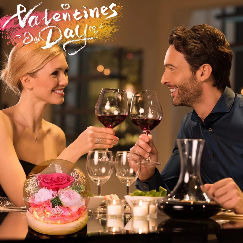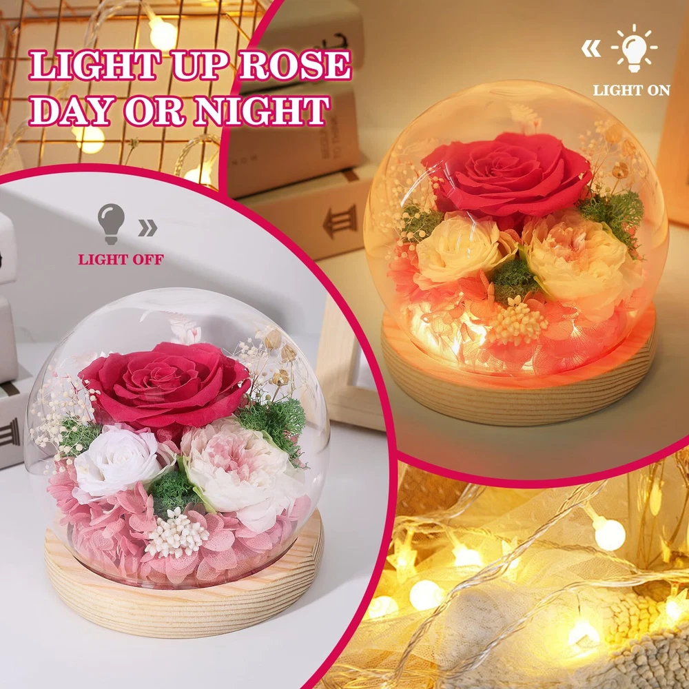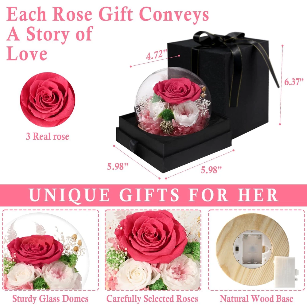 100% Real Roses Last for 3-5 Years:Flowers inside the glass dome are carefully selected natural plants. Real fresh flowers are treated with a complex process to become long-lasting flowers, allowing them to maintain their beautiful appearance and vibrant colors for a long time without wilting or fading. Eternal Bloom & Endless Romance-Let her feel your love:The meaning of eternal flowers is that no matter how time changes, they always stay by your side and never fade. Eternal roses delivered by are handmade one of a kind works of art. Give a charming eternal flower to your loved one and create more beautiful memories in the years to come. Warm Rose Decoration: The rose blooms from the base and is surrounded by a string of LED lights, sparkling eternal rose makes the whole glass dome shine with warm white light, romantic and elegant. Use as a decorative addition to your bedroom, living room, bookshelf and table to brighten up your life. Light is powered by 3 AAA batteries (not included). No Care Required: Green and sustainable, forever flowers don't need to worry about watering and maintenance, and no pollen allergies. Appearance is almost the same as fresh flowers or even more perfect, which can present the natural beauty of flowers. Gift Box Packaging: The attached gift box of the everlasting flowers is convenient to send directly to your mom/wife/girlfriend/best friend. Pick one of her favorite colors for the upcoming special day and hurry up to create more surprises with this loving rose gift.
