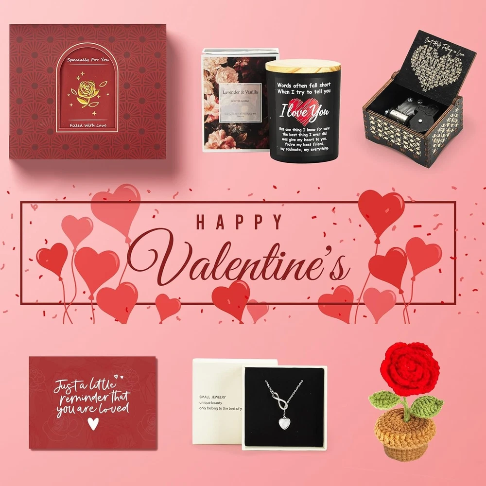 Valentines Day Gifts for Her Romantic Gift for Girlfriend Wife Boyfriend Husband Color Red Product Dimensions 6"W x 3"H Item Weight 16 ounces Number of Items 6 Scent Lavender Vanilla Are Batteries Included No Indoor/Outdoor Usage Indoor Specific Uses For Product Romantic Occasions, Home Decor, Valentine's Day Gift Shape Round About this item 🌹Romantic Valentine's Day Gifts for Her:Surprise your loved one with this thoughtfully curated Valentine's Day gift basket. Featuring a handmade knitted rose, a scented candle adorned with warm, heartfelt words, a timeless wooden music box, an infinity-heart necklace symbolizing eternal love, and a beautifully designed greeting card. This elegant gift set creates the perfect romantic atmosphere to make her feel truly cherished and loved. Ideal for your girlfriend, wife, sister, female friend, or any woman you care about. 🌹Unique Valentine's Basket for Her: This Valentine's basket for her combines timeless charm with meaningful details. The soothing aroma of the scented candle, the delicate craftsmanship of the knitted rose, and the heartfelt melody of the music box come together to create an unforgettable Valentine’s experience. Whether it's for your girlfriend, wife, or special someone, this unique gift is a heartfelt expression of your love. 🌹Valentine's Gift Set with Meaning: Looking for a Valentines gifts for her that stands out? This set features an infinity-heart necklace that symbolizes endless love and connection, a handcrafted rose that lasts forever, and a beautifully written card to express your deepest feelings. Thoughtful, practical, and deeply romantic, this gift basket is perfect for showing her how much she means to you. 🌹Perfect Romantic Gifts for Her: Give her a gift she’ll treasure forever. This romantic gift set is designed to celebrate love in the most meaningful way. From the music box that plays a timeless tune to the luxurious infinity-heart necklace, every item in this basket has been carefully chosen to create lasting memories. It’s not just a gift—it’s a romantic gesture she’ll never forget. 🌹Ready-to-Give Valentine's Day Gift Set:No need to worry about gift wrapping! This beautifully packaged Valentine's Day gift set is ready to impress. With premium materials, a romantic design, and heartfelt details, this gift box is perfect for Valentine's Day, anniversary, or any special occasion. This gift set will touch her heart and convey your warmest wishes. Don't forget to leave a message: select "THIS ORDER CONTAINS A GIFT" at checkout and add a personalized gift message.