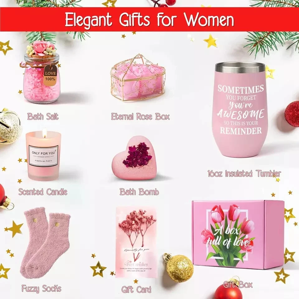 💕【Heartfelt Valentines Day Gift for Her】 The meticulously curated gift boxes are devised to forge a memorable and delightful day, bringing a beaming smile. Ideal for demonstrating your abundance of love and appreciation. Excellent gifts for wife, mom, grandma, girlfriend, daughter, sisters, friends, teachers, colleagues, and more. Great womens gifts for Valentine, Valentines Day gifts for women wife girlfriend 🛁【Stress Relief Spa Gift Set】Treat your loved ones to the ultimate relaxation experience with our spa gifts for women. Immerse her in the serene aromas of sea salt, bath bomb, and soy wax candle. Crafted from natural ingredients, including 100% soy wax and essential oils, allow her to indulge in a rejuvenating spa retreat that soothes the senses and revitalizes the spirit 💝【Radiate Love and Warmth Valentine Gift Box】The premium 16oz vacuum-insulated coffee cup is crafted from 18/8 food-grade stainless steel, ensuring her favorite beverage maintains the ideal temperature. Paired with soft fuzzy socks and adorned with a heart-shaped box of preserved roses—an expression of everlasting love 🎁【Gifts for Women on Any Occasion】Make her day brighter and unforgettable! The gift box labeled "A box full of love,", the coffee mug is embellished with the message "SOMETIMES YOU FORGET YOU'RE AWESOME", showing love, thoughtfulness and a warm reminder to inspire her. Great gift baskets for women for any occasions on Valentine, Christmas, birthday, Mothers Day, thinking of you, get well, thank you, I love you, anniversary, retirement, Thanksgiving, and more đŸŒč【Charming Scented Roses Soap Box】Indulge in the delicate charm of our Scented Roses Box! Crafted in the likeness of a real rose and nestled within a charming heart-shaped gift box, it's a beautiful decoration to add a touch of romance to any room without the concern of wilting. Paired with a greeting card that serves as a heartfelt conduit for conveying sentiments of love and joy 🎆【Convey Happiness and Affection】Each item is carefully selected to delight, including a pink gift baskets, 16oz insulated coffee mug, fragrant soy candle, preserved roses in a heart-shaped gift box, scented sea salt, scented bath bomb, snug fuzzy socks, gift card. Valentines Day gifts for her, birthday gifts for women, Mothers Day gifts, get well gifts for women, thank you gift, I love you gift, anniversary gift, retirement gifts
