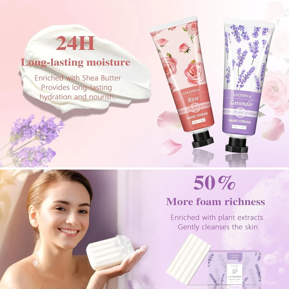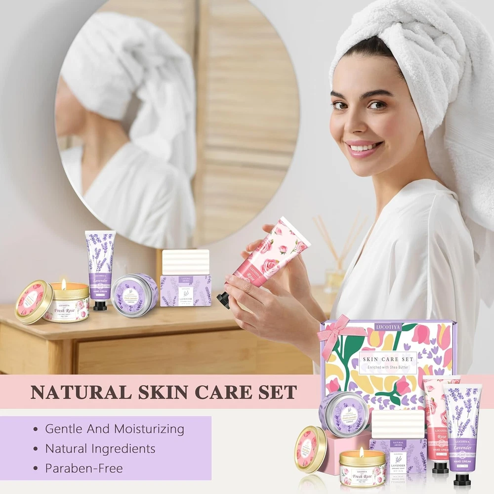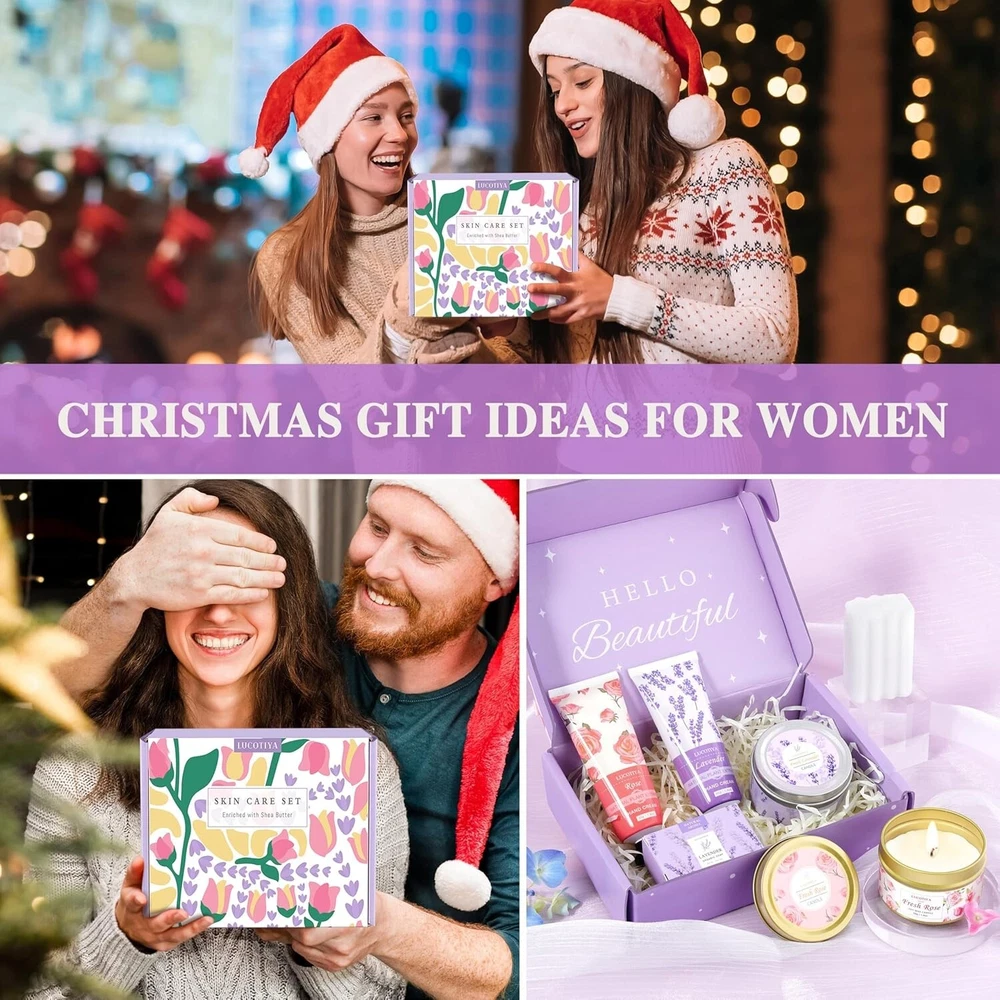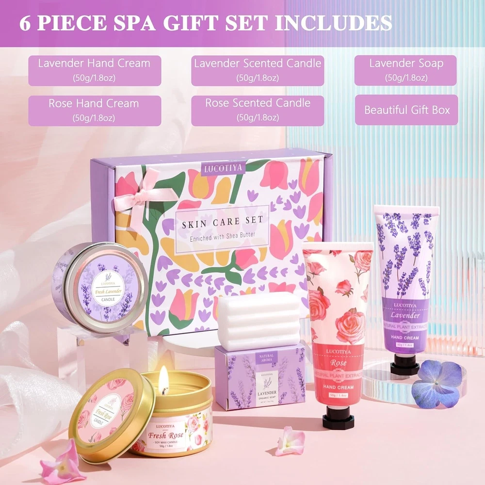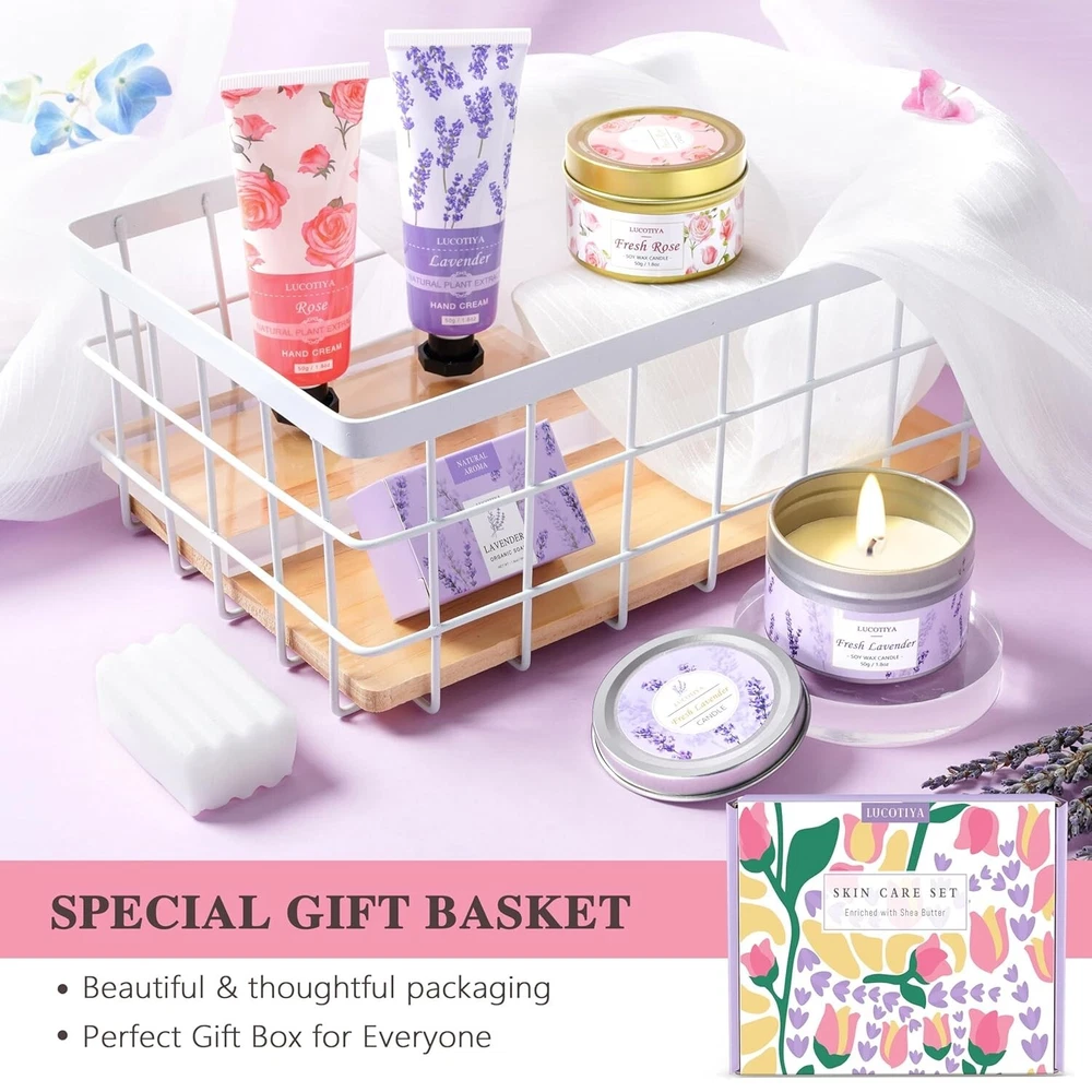 Free eBay listing template designed by dewiso.com Valentines Day Gifts for Her,Love Girlfriend, Wife, Mom-Lavender Spa Basket Set* NATURAL & SKIN FRIENDLY: Unwind and pamper yourself with the scents of Fresh Rose and Lavender. Our spa gift for women are created with Moisturizing ingredients; Infused with pure essential oils and Shea Butter, which help to moisturize and soften dry skin. 6PCS LAVENDER AND ROSE SET: The set includes 2* Hand cream-50ml, 2* Scented Candle-50g, Soap-50g,and a beautifully designed gift box; Scent of lavender and rose create a tranquil atmosphere, perfect for unwinding during any busy day. GIFT IDEAS FOR WOMEN:This thoughtful gift set makes a perfect indulgence for yourself or a cherished present for any occasion, from birthdays to holidays like Christmas, Valentine's Day, or Mother's Day. Elevate your self-care routine with this delightful collection. CHRISTMAS GIFTS FOR WOMEN : All packed in a nice but sturdy gift box with a protective film on the outside of the box.perfect for stocking stuffers during the holidays to nourish skin during the harsh winter months. VERSATILE GIFT: Each gift in our birthday gift box for ladies is carefully selected and wrapped. The best birthday gifts for mom, sister, female best friend, wife, teacher, grandma, boss, coworker or any special lady!Perfect for birthdays, Mother's Day, Valentine's Day, Christmas, or any special occasion.