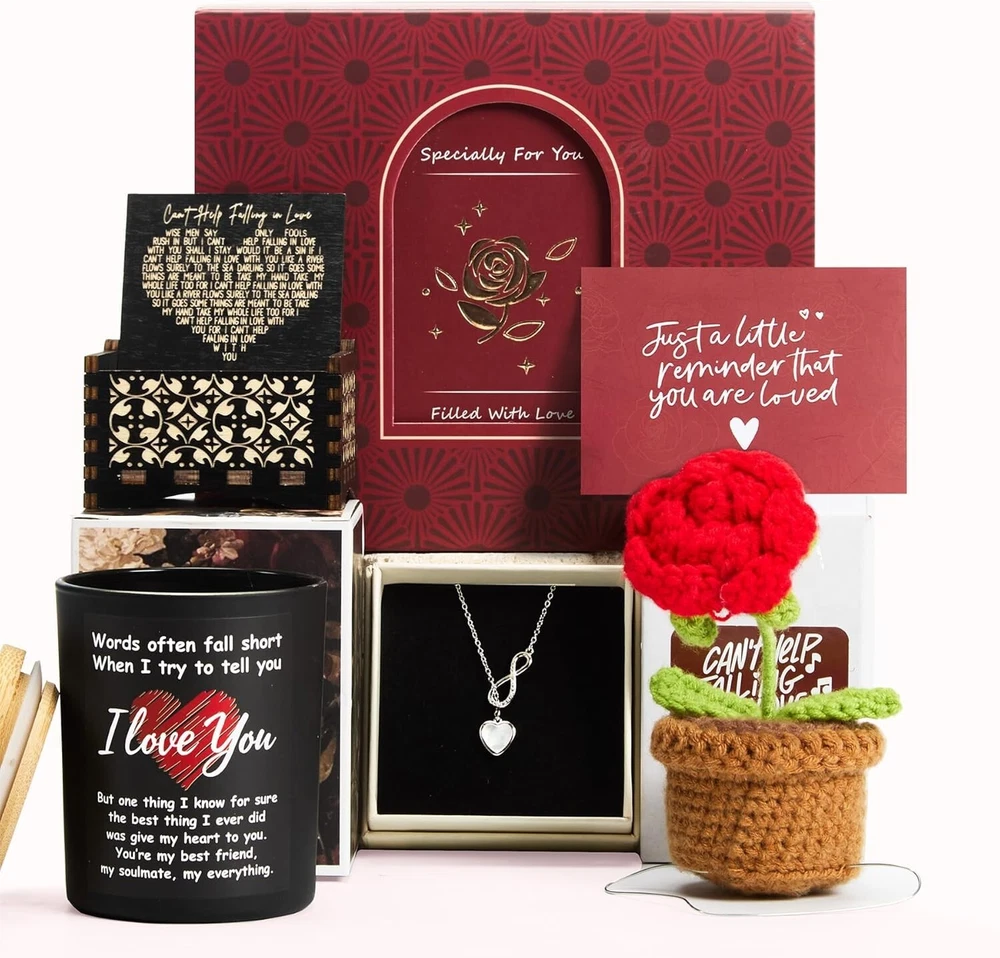Free eBay listing template designed by dewiso.com Valentines Day Gifts for Her, Romantic Gifts for Girlfriend, Wife, Valentine's Gifts Bulk for Her, Valentine Gifts Baskets for Women, Unique Gifts Box for Wedding & Engagement Anniversary Bulk Set About this item Romantic Valentine's Day Gifts for Her:Surprise your loved one with this thoughtfully curated Valentine's Day gift basket. Featuring a handmade knitted rose, a scented candle adorned with warm, heartfelt words, a timeless wooden music box, an infinity-heart necklace symbolizing eternal love, and a beautifully designed greeting card. This elegant gift set creates the perfect romantic atmosphere to make her feel truly cherished and loved. Ideal for your girlfriend, wife, sister, female friend, or any woman you care about. Unique Valentine's Basket for Her: This Valentine's basket for her combines timeless charm with meaningful details. The soothing aroma of the scented candle, the delicate craftsmanship of the knitted rose, and the heartfelt melody of the music box come together to create an unforgettable Valentine’s experience. Whether it's for your girlfriend, wife, or special someone, this unique gift is a heartfelt expression of your love. Valentine's Gift Set with Meaning: Looking for a Valentines gifts for her that stands out? This set features an infinity-heart necklace that symbolizes endless love and connection, a handcrafted rose that lasts forever, and a beautifully written card to express your deepest feelings. Thoughtful, practical, and deeply romantic, this gift basket is perfect for showing her how much she means to you. Perfect Romantic Gifts for Her: Give her a gift she’ll treasure forever. This romantic gift set is designed to celebrate love in the most meaningful way. From the music box that plays a timeless tune to the luxurious infinity-heart necklace, every item in this basket has been carefully chosen to create lasting memories. It’s not just a gift—it’s a romantic gesture she’ll never forget. Ready-to-Give Valentine's Day Gift Set:No need to worry about gift wrapping! This beautifully packaged Valentine's Day gift set is ready to impress. With premium materials, a romantic design, and heartfelt details, this gift box is perfect for Valentine's Day, anniversary, or any special occasion. This gift set will touch her heart and convey your warmest wishes. Don't forget to leave a message: select "THIS ORDER CONTAINS A GIFT" at checkout and add a personalized gift message. Brand LUICONMO Color Red Product Dimensions 6"W x 3"H Item Weight 1 Pounds Number of Items 6 Scent Lavender Vanilla Are Batteries Included No Indoor/Outdoor Usage Indoor Specific Uses For Product Romantic Occasions, Home Decor, Valentine's Day Gift Shape Round Container Material Glass Occasion Anniversary, Birthday, Valentine's Day Seasons Winter Special Feature Valentines Gifts for Her, Decorative Style Romantic Wick Quantity 1 Model Name Valentines Gifts for Her Theme Love, Romance, Valentine's Day Package Information Jar Unit Count 1.0 Count Embellishment Decorative Candle Type Container Candle Size Medium Target Audience Women, Adults Manufacturer LUICONMO UPC 730377183036 Packaging Type Gift Box Part Number Valentines Gifts Item Weight 1 pounds Country of Origin China Item model number Valentines Day Gifts for Her Special Features Valentines Gifts for Her, Decorative Batteries Included? No Batteries Required? No Unique Gifts For this Valentine's Day Valentines Gifts for Her This curated Anniversary present box will make that special woman,man in your life feel so cherished and loved at Valentine's Day 2025