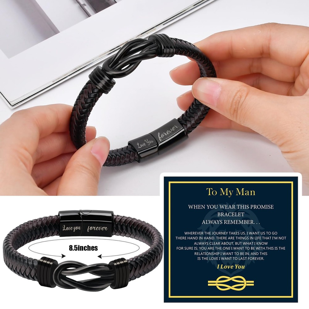 Valentines Day Gifts for Him: Bracelets Gifts for Men Leather Couples Bracelets Anniversary Romantic Gifts for Boyfriend Husband from Wife Valentine's Birthday New Meaningful Valentines Day Christmas Anniversary Gifts for Him Husband Boyfriend:Our knot bracelet means always linked together, and lettering love you forever can directly express your love for him, no matter when, no matter where. Valentine’s Day Ideal Gifts Bracelet for Men:The Leather bracelet for men comes with a designed wish card and a pretty box, Ready to treat your man him boyfriend husband for Birthday, Anniversary, Valentine’s Day,Sweetest Day, Christmas,Stocking Stuffers,Wedding,Holiday and galentines day any special occasion gifts or just a surprise to remind that special one how much you care. Materia and Size:Our knot bracelet is made of superior braided leather and stainless steel charms, so the men leather bracelet is soft durable and comfortable.Our bracelet is 8.5inches and the length can fit most men to wear. How To Wear: Using two opposing forces,you can open it gently.Mens bracelet perfect gifts for men, him, boyfriend, husband, the bracelet has a novel style that never goes out of style. To My Man-"WHEN YOU WEAR THIS PROMISE BRACELET ALWAYS REMEMBER.WHEREVER THE JOURNEY TAKES US. I WANT US TO GO THERE HAND IN HAND.YOU ARE THE ONE I WANT TO BE WITH.THIS IS THE RELATIONSHIP I WANT TO BE IN. AND THIS IS THE LOVE I WANT TO LAST FOREVER.I Love You"The card printed saying you will always be there for him and love him forever. Shipping We offer FREE shipping on all orders! We ship within Three business days of payment, usually sooner. We use a selection of shipping services such as UPS, FedEx, USPS etc. We only ship to the lower 48 states, no APO/FPO addresses or PO Boxes allowed. Local pickups and combined shipping options are not provided at this time. Return You can return a product for up to 30 days from the date you purchased it. Any product you return must be in the same condition you received it and in the original packaging. Please keep the receipt. Payment We accept payment by any of the following methods: PayPal Please pay as soon as possible after winning an auction, as that will allow us to post your item to you sooner! Feedback Customer satisfaction is very important to us. If you have any problem with your order, please contact us and we will do our best to make you satisfied. Contact Us If you have any queries, please contact us via ebay. We usually respond within 24 hours on weekdays. Please visit our eBay store to check out other items for sale! Thank you for shopping at our store.