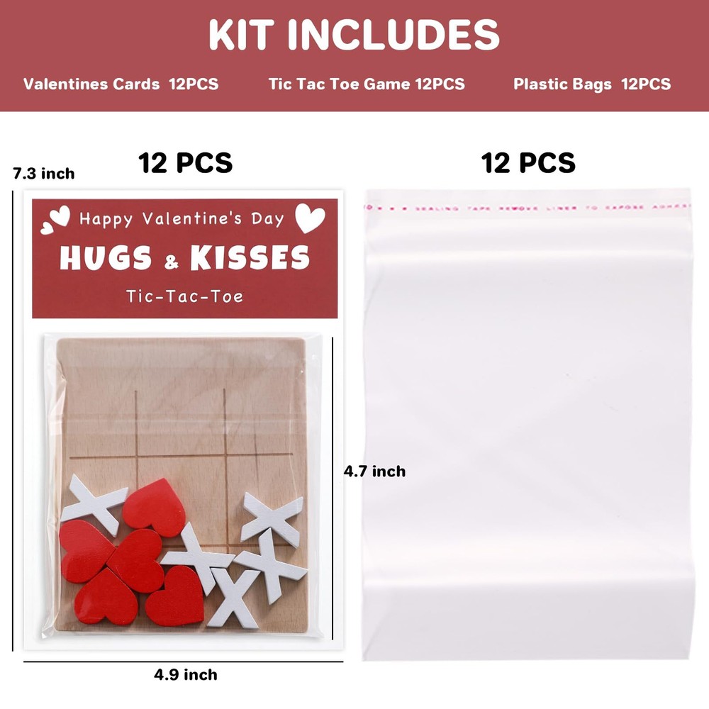 Package includes 12 Valentines Day Cards, 12 Wooden Tic Tac Toe and 12 clear bags.Cards Size 7.3x4.9 inch. Valentine's Day tic-tac-toe set is crafted from quality beech wood, The smooth, solid wood offers a premium tactile experience, making it stand out from ordinary plastic gifts. Each card is printed with Valentine’s Day-themed sayings related to tic-tac-toe,spreading friendship among children.The cards also have a space for kids to write their own name, adding a interesting touch to Valentines Day. Featuring red heart and white "X" game pieces, this set is visually delightful, capturing the spirit of Valentine's Day with love and hugs. Whether it’s a preschool party, school exchange, or family gathering, this Valentine’s gift Tic Tac Toe set suits all occasions, making it perfect for boys, girls, and toddlers to share and enjoy.