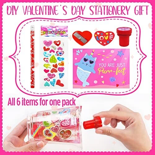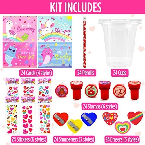Return Policy Fast Delivery Trusted seller Valentines Day Gifts for Kids - 24 Pack Valentines Day Stationery Gift with Cards Pencils Stickers Erasers Stampers Sharpener Cups Classroom Prize School Exchange Boys Girls Party Favors Product Description Valentine's Day stationery set includes 24 cups, 24 pencils, 24 cards, 24 stickers, 24 stampers, 24 sharpeners and 24 erasers. Total of 168 pieces. Plastic cup measures 4.1" tall. Holds a variety of stationery Card measures 4.8" x 2.2". 4 styles of unicorn design Bulk cards and stationery are great for DIY unique gifts with kids Ideal for school exchange, teacher classroom prizes, Party Favors Supplies Shipping Returns Payment Shipping Shipping is FREE to all addresses other than APO/PO boxes in the lower 48 states. All our stock ships from US-based warehouses. Shipped via USPS or UPS (depending on location and package weight) Unless stated otherwise, all orders will ship within 24-72 hours of your payment being processed. Check our feedback to see the great reviews of FAST shipping we offer. Returns Seller does not accept returns Payment We currently accept payment via eBay managed payments only. Once payment is cleared, we will dispatch your shipment within 1-3 business days. Please refer to the "Shipping" tab for more information regarding shipping speed to your destination.