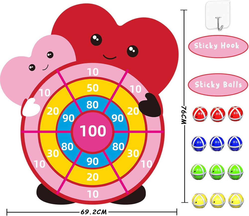 【Valentines Day Gifts for Kids】30in Valentines dartboard (with hook), made of high quality soft fabric, durable, and comes with 12 plastic sticky balls with strong stickiness, can be firmly attached to the dart board. Valentines toys dart board gifts for kids 4 5 6 7 8 9 10 Year Old, indoor or outdoor game for kids age 3-10. 【Valentines Decorations】30” Valentines decor for your Valentines party decoration supplies. Valentines Gifts can be hang on wall or indoor outdoor to create a scene during Valentines, wow your guests with this interesting Valentines party favor! 【Practice Target/mathematics】Valentines dart board game is safer than traditional darts, and children can play unlimited. It is a very good tossing toy for kids to improve their hand and eye coordination, playing with friends can enhance friendship and develop the ability to coordinate. Fun for toddlers to practice aiming, practice math by adding scores. Perfect Valentines gifts toy exchange for boys girls. 【Valentines Family Party Games】The Valentines dartboard toy is a good parent-child interactive game which accompanies children to grow up and bring fun for kids. Dart board game is also a good helper for stress relief and active atmosphere, balls have 4 colors which support multiplayer competition, suitable for any age, enrich life, draw closer to each other. Great fun party game!! 【Great Gift Idea】If you are confused about the upcoming Valentines or your kid's birthday, this dartboard is best ideal Valentines gifts for 3 4 5 6 7 8 9 10 11 12 years old boys and girls. Product Description