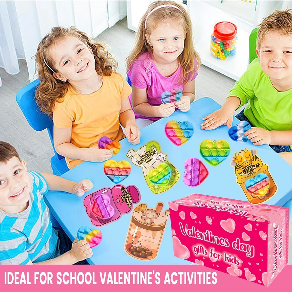 40PACK VALENTINES DAY GIFTS: This valentines day gifts contains 40 x pop it keychains and 40 x valentines day cards. Each color mixing toy color echoes the card color. Ideal valentines day gifts for kids. SAFE & NON-TOXIC MATERIALS: Each product is made of child-friendly materials and the toys are nationally CPC safety certified to ensure compliance with U.S. safety standards. Ensure a safe and joyful Valentine's Day for the kids. PRE-FILLED VALENTINES HEART POP IT: Our Valentine's Day toy cards are pre-filled and designed to save you time wrapping gifts by eliminating the need to purchase additional cards or toys. Making it easy for you and the kids to enjoy a fun-filled Valentine's Day. PERSONALIZED VALENTINE DAY CARDS: The back of the card is designed with a special “FROM” & “TO” section where kids can write their names and share the joy of Valentine's Day. The personalized design makes children feel more involved in the holiday. VALENTINE PARTY FAVORS FOR KIDS: These Valentine's Day themed sets are perfect for classroom exchanges, school Valentine's activities, elementary gatherings, and as Valentine's party gifts, add fun and creativity to any event. Product Description