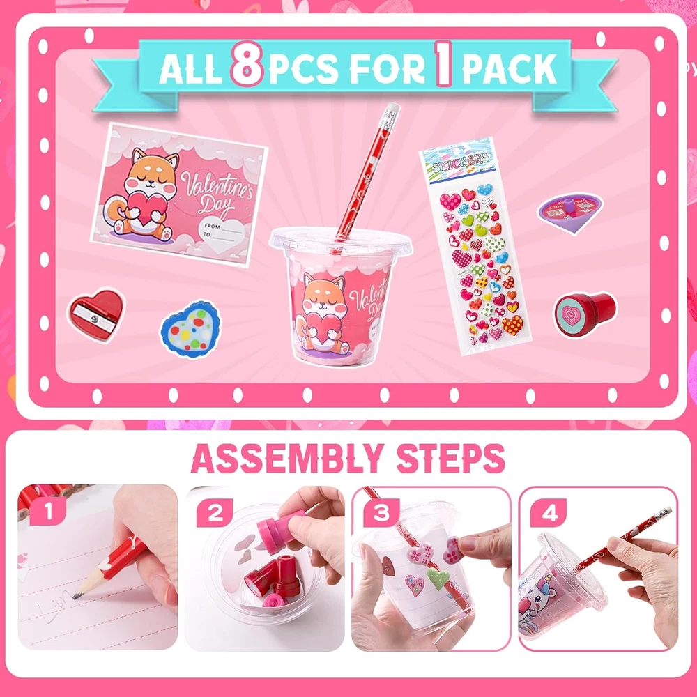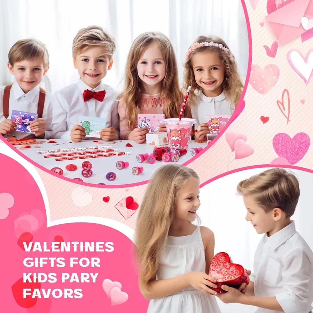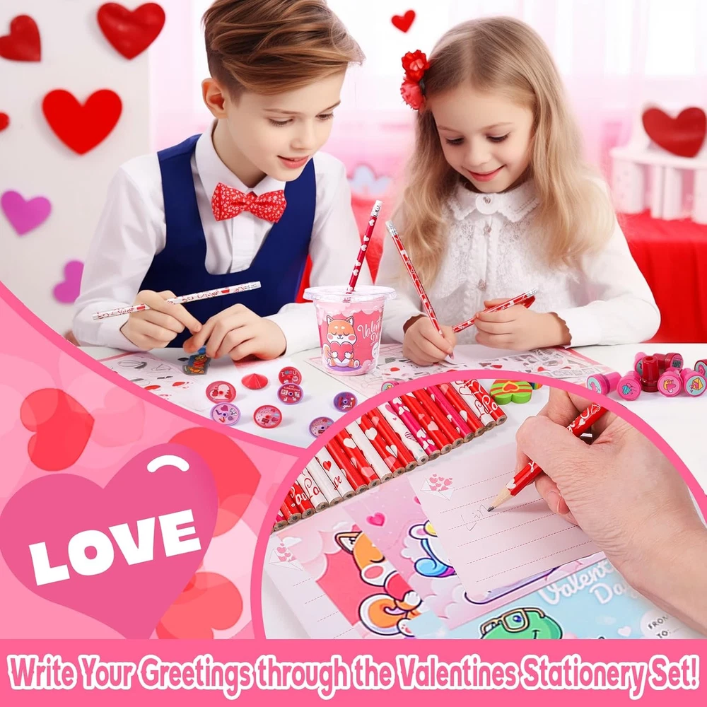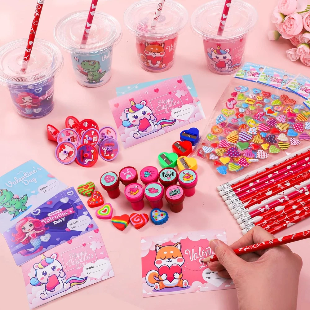 Plentiful Kids Valentines Gift Stationery Set: This 224 PCS Valentines day gifts for kids comes in 28 packs stationery set, 8 PCS per pack. Includes 28 cups with lids, 28 pencils(4 style), 28 greeting cards(4 style), 28 sharpeners(4 color), 28 Erasers(6 style), 28 spinning tops(6 style), 28 3D stickers(7 style) , and 28 stamps(10 style). Our stationery set is the first choice for kids Valentines day gifts which definitely surprise every kid in the classroom Ideal Gift for Various Occasions: With a colorful design and practical functionality, our Valentines day stationery set is very suitable for various scenarios such as study stationery, class rewards, class activities, game prizes, school prizes, goodie bag stuffers, Valentines day gifts exchange, kids party favors, etc. No one can resist such an exquisite stationery set Exquisite Design & Premium Quality: Our practical stationery set is a huge hit with kids because it features many colorful and sweet Valentines day designs including hearts, animals, fruits, etc. It is mainly made of top-quality plastic, paper, and wood that meets the US toy standards. Our stationery set is rather safe and durable for kids school supplies Educational and Unforgettable Time: Using this colorful and practical stationery can not only enhance children's interest in learning but also cultivate their hands-on and social skills. Meanwhile, expressing gratitude and love by writing greeting cards greatly promotes the relationship between parents and children, teachers and students, and classmates. Let's enjoy endless fun and happiness in unforgettable Valentines day activities Easy & Exclusive DIY: No tool, no glue! It's easy to DIY unique Valentines day gifts for everyone. All stationery is colorful and varied. Kids can match different stationery and put them into transparent cups that can be decorated with 3D stickers and greeting cards with heartwarming words. And there is still room in the cup for extra Valentines treats. Personalize your Valentines gifts and let your creativity shine Valentines Day Gifts for Kids Classroom 28 Pack Valentines Day Cards for Kids School Exchange, 224PCS Stationery Set with Cups Party Favors Valentines Day Goodie Bag Stuffers Boys Girls