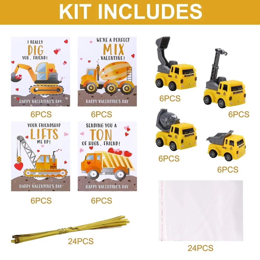 Package includes 24 Valentines day cards, 24 construction vehicles toys car, 24 clear bags and 24 golden ties.Cards size 5x3.9 inch. This 24-pack Valentine’s Day card set features a construction vehicle theme, with each card displaying adorable sayings. It adds creativity and fun to kids' Valentine’s Day celebrations. Includes four different types of construction vehicle toys—excavators, cement mixers, cranes, and dump trucks—adding variety and excitement for kids during exchanges. Simply use a ties to attach the toy car through the hole on the card, making it easy for kids to assemble themselves, adding an interactive touch to their Valentine’s experience. Ideal for preschool and elementary school Valentine’s Day exchanges, this card and toy combination creates a fun way for kids to interact and share friendship, making it perfect for classroom parties.