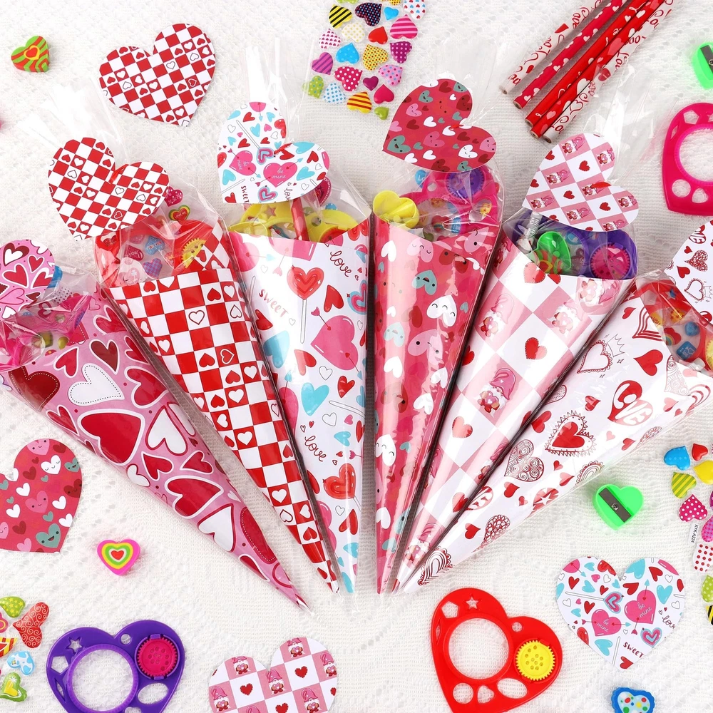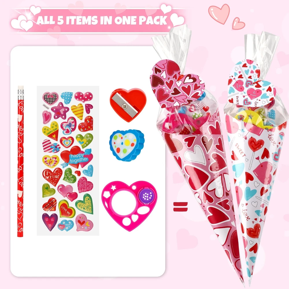 Valentine's Day Gifts for Kids-30 Pack Valentines Sweet Cones Shaped Stationery Gift for Classroom, Creative Valentine Exchange Gift Set with Clear Bag Heart Card Pencil Sticker Eraser Sharpener Ruler Product Details Color: Red Material: Paper Brand: Giiffu Unit Count: 30.0 Count Theme: heart Item dimensions L x W x H: 7 x 7 x 0.01 inches Occasion: Valentine's Day Manufacturer: Giiffu Age Range (Description): Kid Product Dimensions: 7 x 7 x 0.01 inches Item Weight: 1.98 pounds Item model number: AI-169 Manufacturer recommended age: 4 years and up Creative Valentine's Day Stationery Gift Exchange Set-This Valentines sweet sones stationery set includes 30 cellophane cone shaped treat bags, 30 heart shaped gift tags, 30 valentines card papers ( 6 style ), 30 pencils, 30 stickers, 30 sharpeners, 30 rulers and 30 erasers. Total of 240 pieces. Valentines DIY Crafts Exchange Gift Set Idea-This valentines gift set is packed with an assortment of valentines themed card papers and stationeries, which are put into the included clear cones treat bags, then close by the included ties and heart shaped gift tags, this cute DIY cone stationery gift is sure to bright everyone. Valentines Day Gift with Giant Size-The clear cones shaped treat bag meatures 15 inch tall, the valentines themed card paper measures 7.8 inch x 7.8 inch, 6 styles of design, candies or sweets could also be added. The finished sweet cones shaped stationery treat bag measures 14 inches tall , a giant valentine's gift for kids parties. Unique Valentines Day Exchange Gift Ideas-Combine with the idea of traditional valentine's day gift card and creation of sweet cones, packing stationery into the sweet cone shape treat bags, this unique valentines stationery cones kit contains everything, which is great for school aged children. Valentine's Day Arts Crafts Party Fovors-This Valentine's Day cones shaped stationery bulk set is ideal for school exchange, kids Valentine's Day, Teachers Classrooms, classroom prizes, kids Valentines Day parties, Home School party favors, Valentines Stationery Gift, Birthday Party Gift and so on.