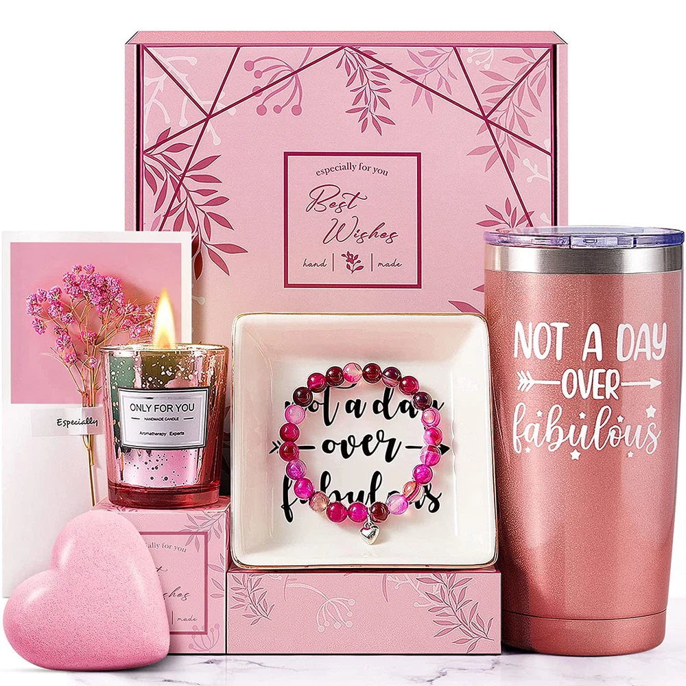 UNIQUE GIFT IDEAS FOR WOMEN: Every item in our handmade gift box is carefully selected. Designed to delight and impress with it’s thoughtful curation and stylish design. This gift baskets is perfect as sister gifts, Mom Gifts, Best friend gifts for women. It's perfect gifts for mom, Wife, Girlfriend, Aunt, Grandma, Women Who Have Everything or any special woman in your life! PERFECT GIFT BASKET FOR WOMEN: Looking for the perfect gift for that special woman in your life? Look no further than this luxurious handmade gift set. You can send this unique gift to them on their birthday, Retirement, Mother's Day, Christmas, Thanksgiving, Valentine's Day, Anniversary, Graduation or any other special occasion. FABULOUS RELAXATION GIFTS FOR WOMEN: Each gift box contains a 20oz handmade coffee tumbler and a ring dish printed with "Not A Day Over Fabulous", A handmade birthday candle, A natural agate bead bracelet exudes a calming and grounding energy and a bath bomb making it the perfect addition to any self-care routine.All beautifully packaged in a gift box to give your loved ones an unparalleled experience. WOMEN'S GIFTS READY: This gift set also includes a delicate dried flowers greeting card and a high quality, reusable gift box, You don't have to worry about a thing! We make gift giving fun and easy! Elegantly designed and filled with thoughtful gifts! Make her feel pampered on Christmas, Her birthday, Or Anniversary with this luxury gift box for women! BACKED BY OUR 100% PROMISE: Spoil her with super cool gift box for women that any wine and coffee lover will appreciate. Buy with confidence. PLEASE ADD YOUR PERSONALIZED MESSAGE BY CHECKING "This order contains a gift". If for some reason they don't like it, Please return it for a no questions asked refund. Product Description Ultimate Birthday Gift Set Pamper Women, Moms, Best Friends & Sisters – Featuring Tumbler & Relaxing Personalized Luxuries Elevate your gifting experience with our premium-quality, thoughtfully designed luxe set. Unrivaled in luxury, this gift set impresses with its stylish, thoughtful design—a perfect indulgence. 6 Exquisite Gifts, Artfully Packaged to Delight & Create Unforgettable Moments Savor the Moment 20oz Insulated Tumbler Keeps Coffee or Tea Perfectly Warm, Enhancing Every Sip She Takes. Boost Daily Bliss Radiant Agate Bracelet Enhances Positive Energy, Paired with Stylish Ring Dish for Effortless Organization & Display. Captivating Birthday Candle Illuminate Her Day with Radiant Elegance, Enveloping Celebrations in a Cozy, Blissful Embrace Soothing Bath Bomb Delight in a Sensory Spa Escape, Infusing Her Self-Care Routine with Luxury & Tranquility Cherished Moments Gift Set Celebrate Her Birthday, Retirement, Mother's Day, Christmas, Thanksgiving, Valentine's Day, Anniversary & Graduation
