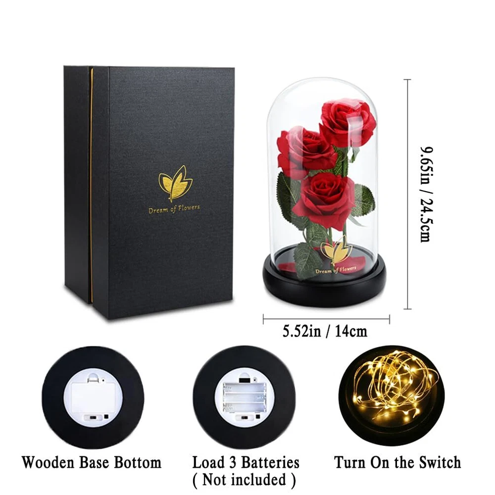 【Valentines Day gifts for her】Valentines Day gifts -rose means that the are perfectly and eternally stored in A Glass Dome. Both glass and base are easy to clean. Glass dome rose also would look amazing as a centerpiece in your living room or bed room 【Gift Idea for Holiday】Rose gift will came with a beautiful packaging Gift box,so that you could give directly without spend time on package.Great romantic rose flower Valentine's Day Gift, Thanksgiving Gift, Mother's Day gift, birthday present and wedding gift for lovers and friends. 【Eternal LOVE】This glass rose will never withered or decayed, symbolizing that your love for her will never change no matter what happens. That's a good way to express your feelings to your mom, wife, daughter, grandma and everyone you cherish. 【Decorative LED Lights】The rose in glass dome is wrapped around LED fairy lights, which are powered by 3 AAA battery (Not Included). It glows warm light through the transparent glass in dark, creating romantic ambience and accompanying people spend lonely night. 【Widely Occasions】On Valentine's Day, Mother's Day, Christmas, Thanksgiving Day, anniversary, birthday, engagement, you can convey your appreciation, best wishes, deep love and sincere to her/him by this gift, which will give her/ him a surprise, making her/him smile happily from heart.