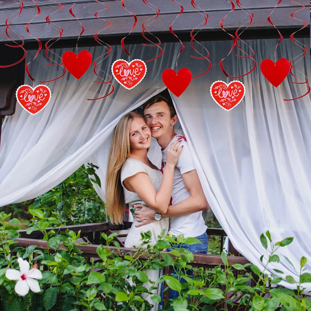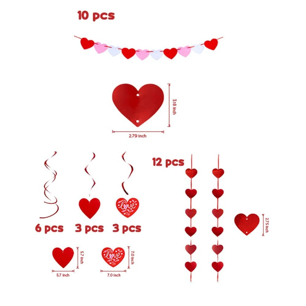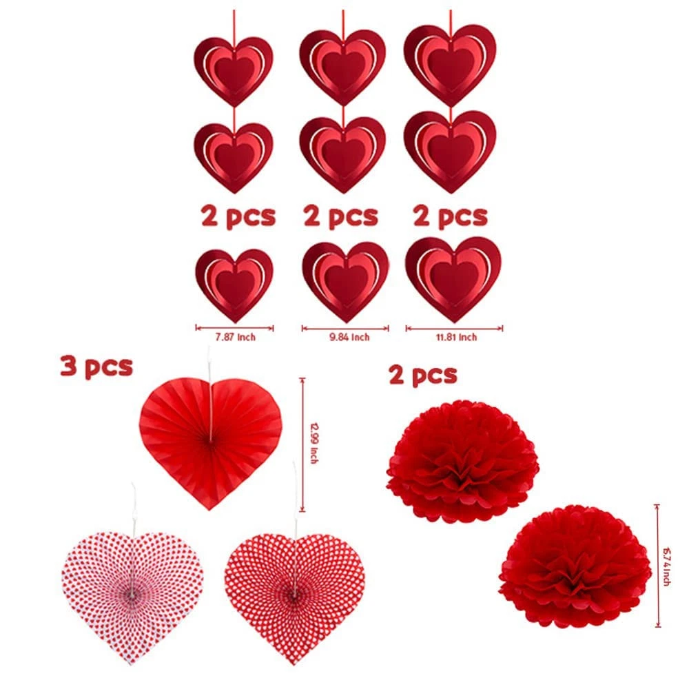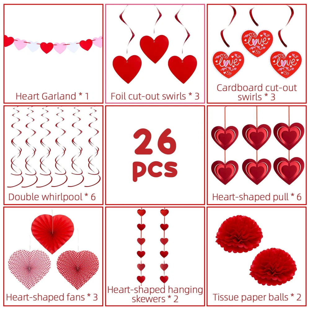 Valentines Day Heart Paper Kit Party Decorations, Red Heart Swirl Hanging Decorations for Wedding Valentines Decor Anniversary Party Supplies 【Super Value Pack】 The Valentine’s Day Decoration 26 Set includes: 1-Heart Garland, 3-Foil cut-out swirls, 3-Cardboard cut-out swirls, 6-Double whirlpool, 6-Heart-shaped pull, 3-Heart-shaped fans, 2-heart-shaped hanging skewers, 2-tissue paper balls. 【Premium Quality】These Valentines decoration is reliable and reusable, are made from quality materials with 3 kind of red colors, lightweight and not easy to deform. A variety of heart shapes and sizes brings an ideal vibe. 【Classic Design】These Valentine's day decorations for parties are designed with heart shape and printed with sweet patterns, coupled with classic red colors, delicate and romantic, which will easily catch the attention of people. 【Easy to DIY】These Valentine’s Day heart decorations are easy to make and decorate. You can enjoy the joy of decoration work in this process. hot red and pink, different colors bring you some romantic and cozy atmosphere to your party. 【Use Widely】These decoration tissue paper set is not only suitable for Valentine's day, but wedding, birthday party, bridal shower or room decor, helpful to happy vibe making for any cheerful festival.