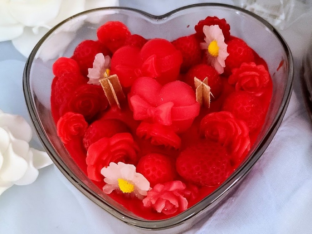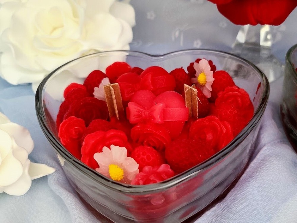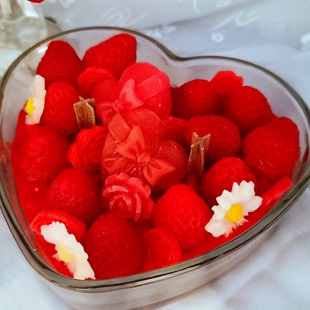 This is a large, heart-shaped jar candle made of soy wax. With a multicolor design, it is 6 inches in diameter and 2 inches in height, weighing 20 oz. Handmade in the United States, this decorative candle features an Art Deco style and a slight scent. Perfect as a Valentine's Day gift, this unique candle adds a special touch to any home decor.