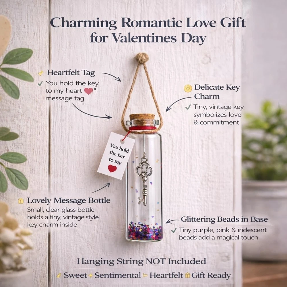 Free eBay listing template designed by dewiso.com Valentines Day Love Gift For Her, Him, Her, Mom, Cute Anniversary Wedding Gifts, Christmas, Romantic Gifts for Girlfriend & Boyfriend, Wife, Home Decors Wall Pediments FREE AND FAST SHIPPING! About this item ❤️ You Hold The Key To My Heart: Ideal Love Gift for Valentines Day Gift For Her, Him - Show a special someone how much he/she means with a cute gift. Express your love with a dainty jar key hanging in a mini message bottle. Write your love letter on the tiny card and surprise your sweetheart. It can be used as Home Decor Accents Wall Pediments, and can be hung on the wall using a string ❤️ Treat Your Husband, Wife, Boyfriend, Or Girlfriend: Looking for special Valentines Day gift, anniversary gifts for her, wedding anniversary gifts for him, best gifts for her or him, galentines day gift for her, galentines gift ladies, boyfriend gifts, or girlfriend gifts? You are in the right place. ❤️ Cute Stuff Proudly Made In The Uk: This message in a love bottle wedding present is crafted by a family-owned handmade studio in The UK. It is made with great attention to detail and stands out among similar romantic gifts for him or her for its quality and design. ❤️ Offer Your Romantic Gift Right Away: Our love is a creative and surprising gift; The best present anyone could wish, perfect for a birthday, holiday, anniversary, Mother's Day, Christmas, Father’s Day. ❤️ Brighten Your Home Decor: This elegant glass cork bottle will look fantastic on your coffee table, nightstand, or desktop. With the vibrant red ribbon and colorful glitter inside the bottle, it will add a splash of color to your room decorations. Product We offer a 30-Day Return Policy on items which you are not completely satisfied with. You have the option for a full-refund or an exchange of the item. No returns are available on items shipped outside of the US . Shipping We offer Free Shipping to the US and ship within 2 business days of payment, usually sooner. We use UPS express shipping. That's why your products are usually delivered within 3 days . Contact We try our very best to make sure every customer is completely satisfied. If there's a problem , message us! We're happy to help. 24/7 live chat available.