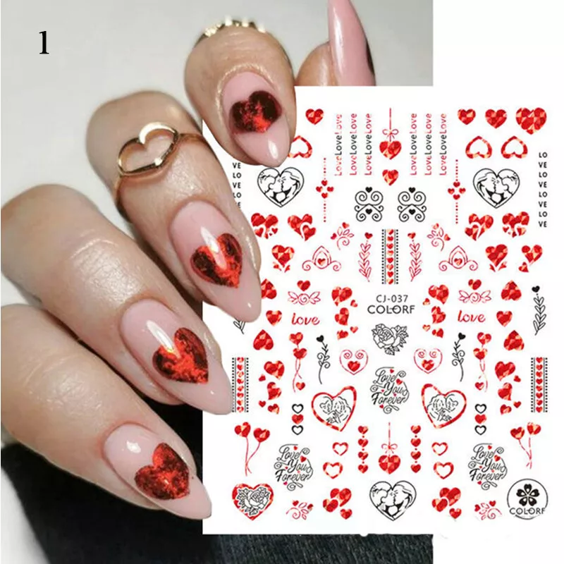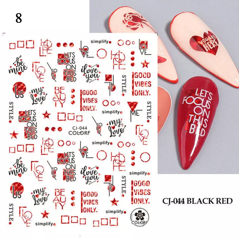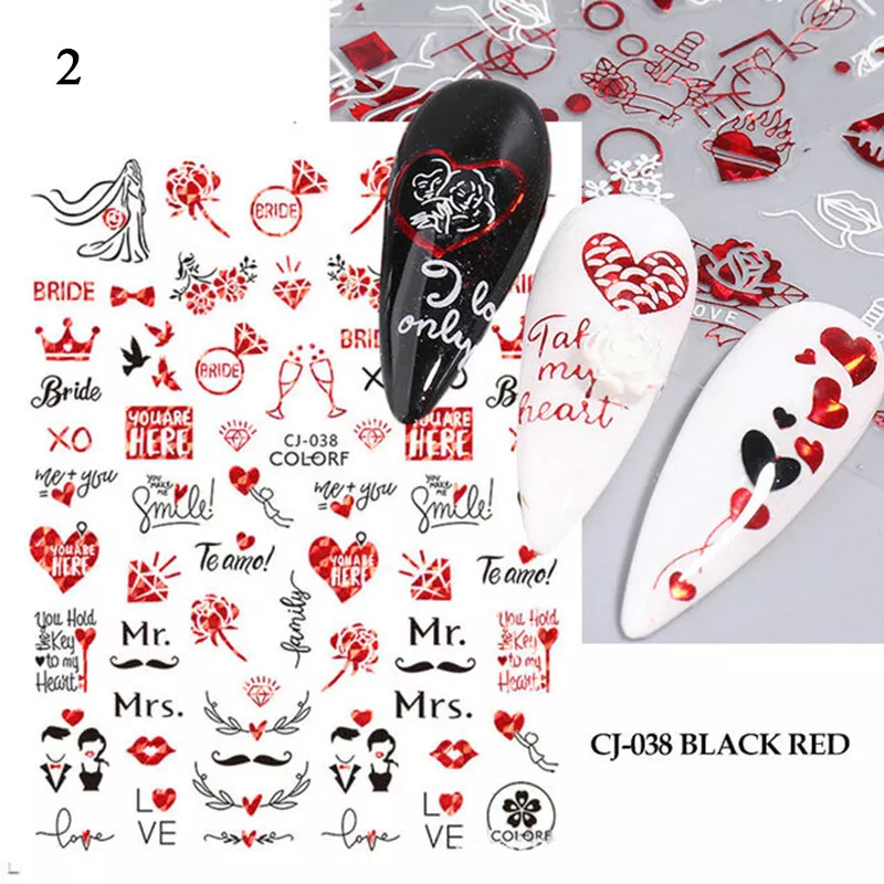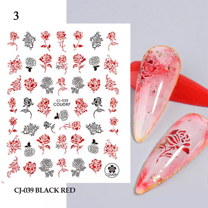 100% Brand New Type: Self adhesive nail sticker Color: Black,Red Type: 3D Nail sticker Usage: Nail Decoration Feature:Self-Adhesive Quantity: 1 Pc Sticker Package Contents: 1 Sheet Nail Stickers How to use: 1. Pick up a part of the sticker. 2. Applying a base gel and wait it dry completely. 3. Select a base color that your like and apply it onto your nails, then wait until it 90% dry. 4. Use tweezers to gently remove the prepared sticker place it onto your nail and press it. 6. Apply top coat for a perfect effect. NOTE: Do not apply stickers to sensitive skin. Not recommended for little children.