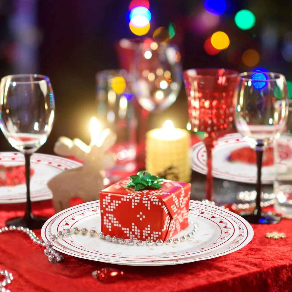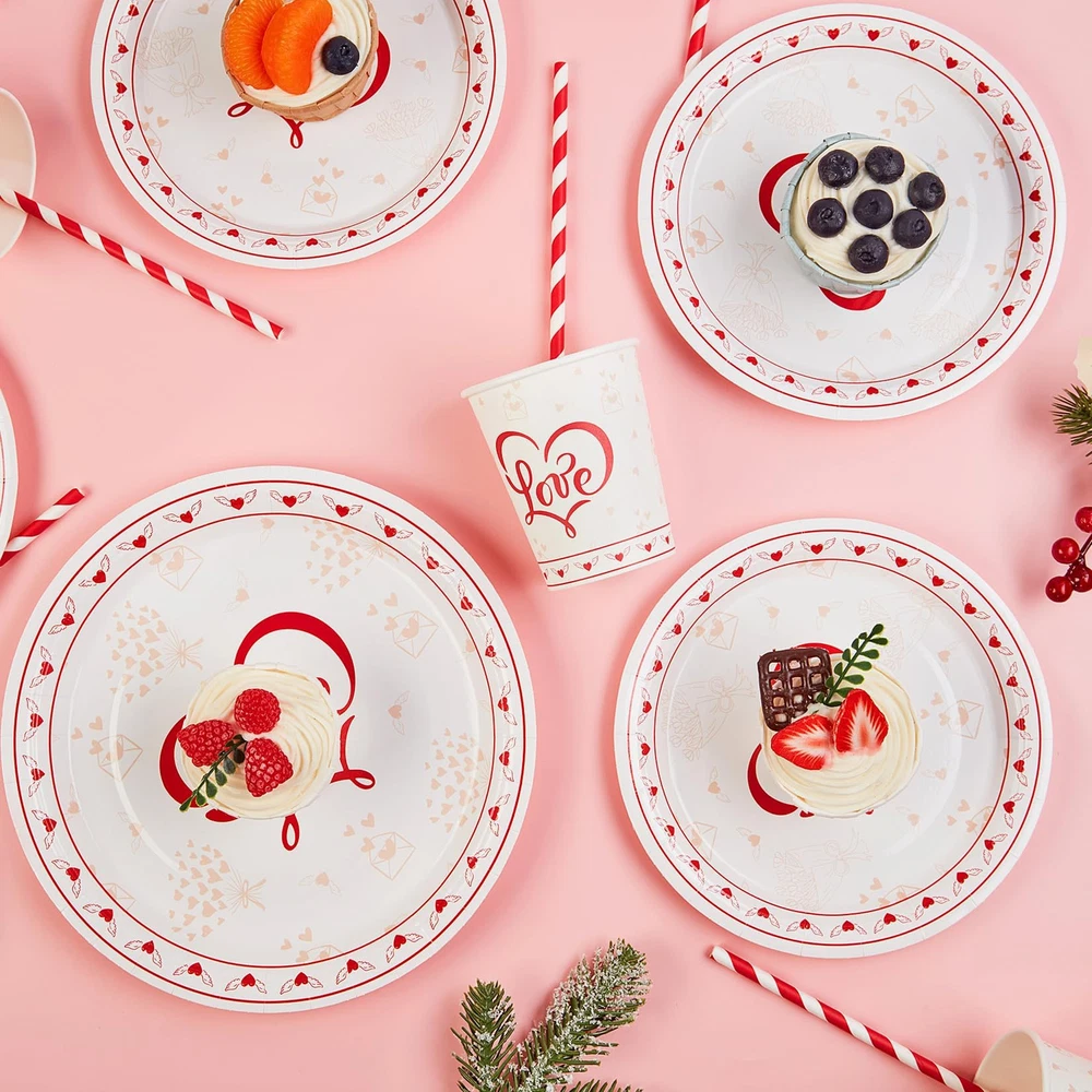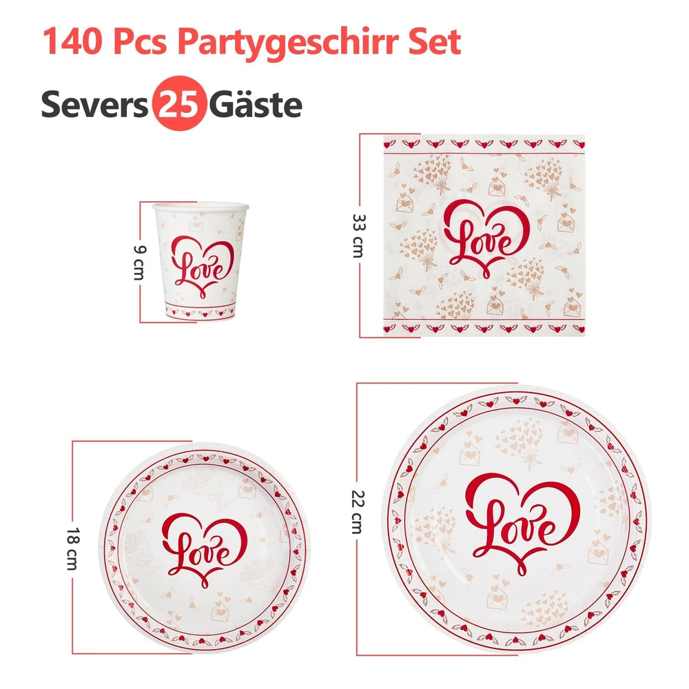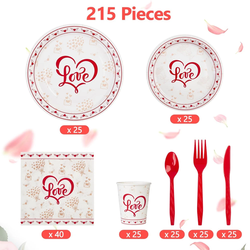 Valentine's Day Party Supplies, Red Heart Love Decorations Disposable Paper Plates Napkins, for Valentine's Day, Engagements, Wedding, Anniversary, Birthday Party, Serve 25 Valentine's Day Party Supplies: Valentine's Day party supplies perfect for any party! We choose red and white heart love to make the design more attractive and exquisite. You can easily create a romantic party atmosphere. There are special party supplies that can bring you a different party celebration. Premium Quality: Paper plates made of thick and durable whiteboard paper, High quality, Plates are thick and rigid and won't fold while carrying food. Safe and environmentally friendly, flatware set is 100% safe material. Save Your Time: The disposable tableware and waterproof tablecloth which can save you from the hassle of cleaning spills and washing at the party. Enjoy more time with your families and friends. Valentine's Day Disposable Dinnerware Set: The perfect party package contains all the party supplies needed for Valentine's Day. This party paper dinnerware set comes with 25pcs 9" dinner paper plates, 25pcs 7"dessert paper plates, 40pcs napkins, 25pcs cups, 25pcs forks, 25pcs knives, 25pcs Spoons, enough to serve 25 guests. Love Decorations: Valentine's Day party tableware will help you style the perfect tables at your event. Your love will adore this coordinating set and it will greatly enhance your theme decor. Elevate your table place settings and impress your guests.