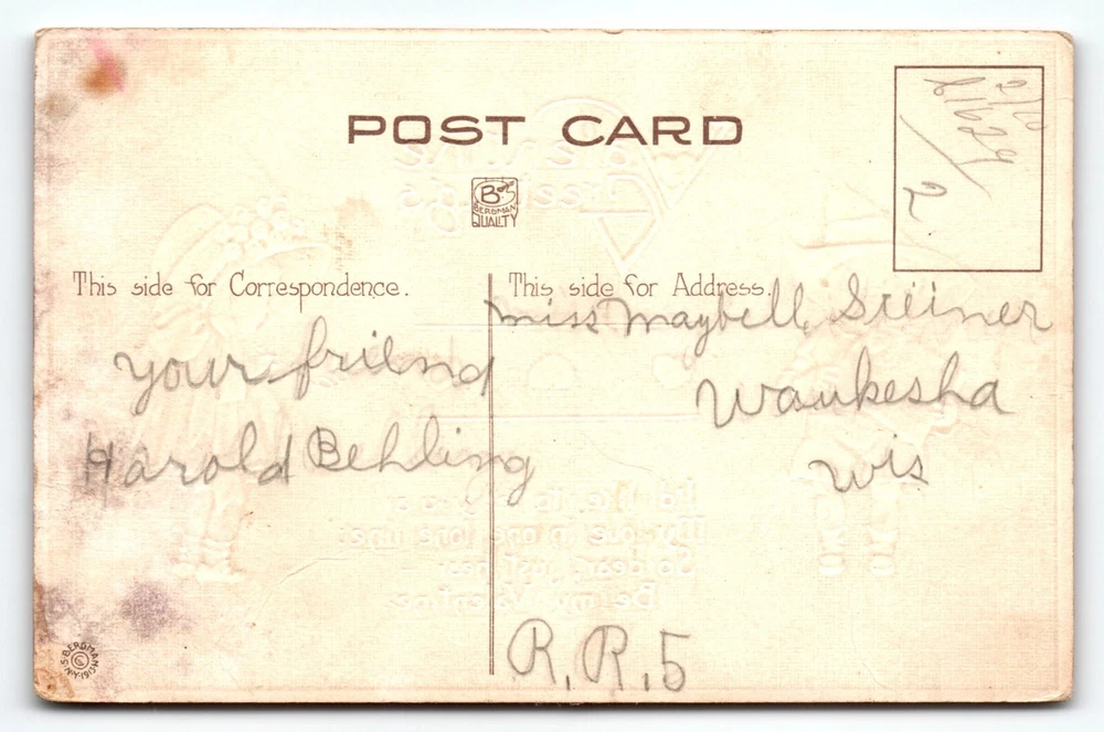 Celebrate Valentine's Day in style with this beautiful postcard featuring a charming little girl with big hat and reading glasses. The lithograph print is an original from Heinmuller and was manufactured in 1913, portraying the innocence and beauty of children. The embossed and divided back features lovely art with hearts, people, and greetings, making it perfect for any occasion. The postcard is standard size (5.5 x 3.5 in) and made of high-quality paper. This non-topographical postcard is unposted and in great condition. Get yours today and add some love and art to your collection! Unposted. Antique original vintage post card. Has soiling, rounded corners, corner dings, and age wear. Stock #VAL129. Additional postcards are in our store. Use cart to bundle and save. All post cards are old originals and may or may not have writing on back. Please review all the photos. Thank you.