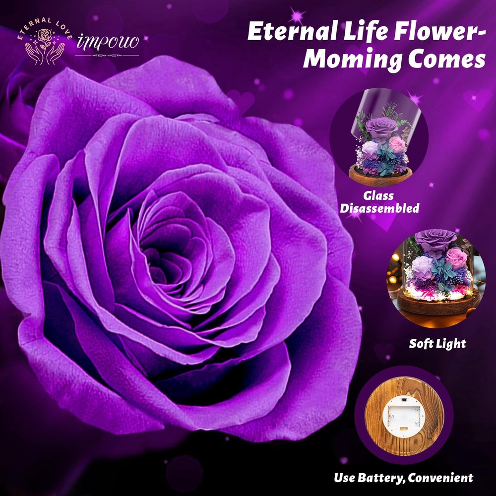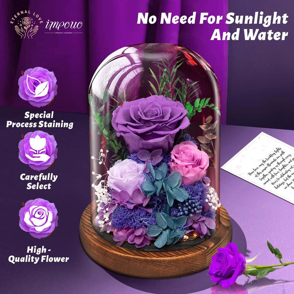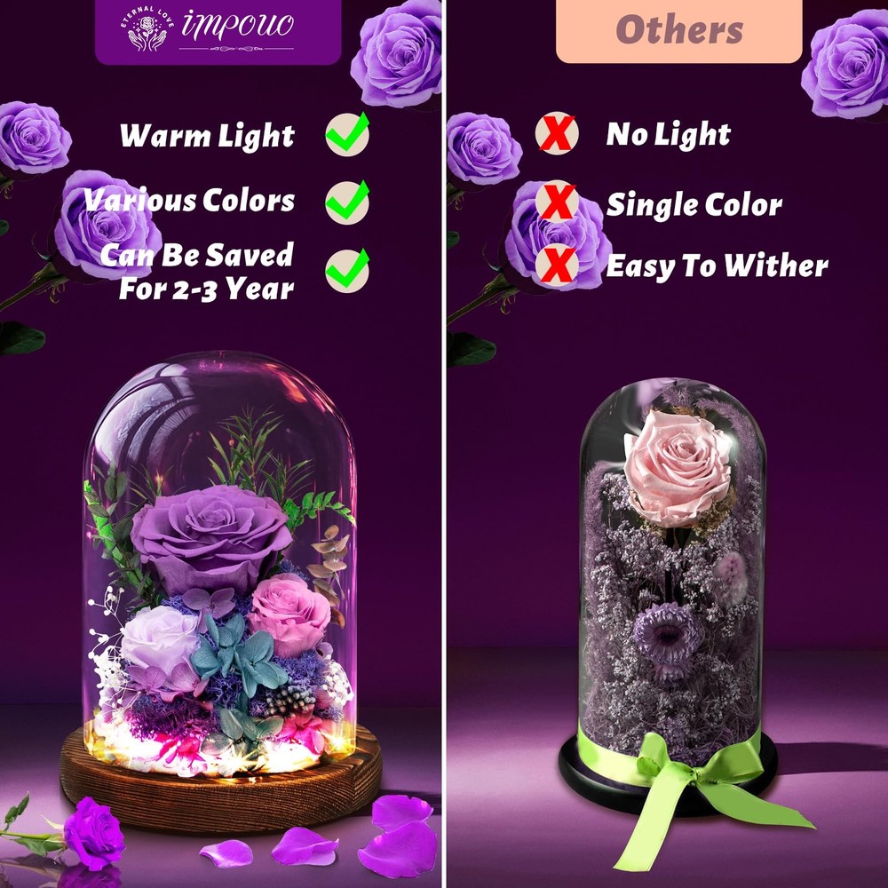 Christmas Flowers Gifts For Women Preserved Rose in Glass Dome, Forever Flowers, Birthday Gifts For Women, Wife, Mom, Grandma, Friend, Sister - Pink Natural Decoration that Evokes Positive Feelings: Having natural flowers in your space not only enhances its appearance but can also have a positive impact on your mood and creativity Breathable LeatRomantic Warm Light: This flowers needs to be powered by batteries (not included). When you switch on, gentle and warm white light will illuminate everywhere around the roses in the glass dome and surroundings, to create a dreamy and romantic atmosphere in the bedroom and living room. Our galaxy flower rose gift is a great choice to promote the happy and romantic vibe on anniversary, birthday, candlelight dinner, Christmas Eve, wedding party, etc.her Lining Long Lasting: Unlike fresh flowers, preserved flowers do not wilt or fade over time. They can be displayed indoors or outdoors, and will stay fresh and beautiful for an extended period of time Breathable LeatBeautiful Display: The flowers are arranged in a way that creates a stunning visual impact, and can be displayed on a table, shelf or any other suitable locationher Lining Breathable LeathUnique Gifts for Women: Our preserved flowers bouquet is a perfect gift for any occasion, including Valentine's Day, Mother's Day, Anniversary, Birthday, Christmas, New Year's and more. It is a timeless gift that will be cherished by your loved ones for years to come.er Lining