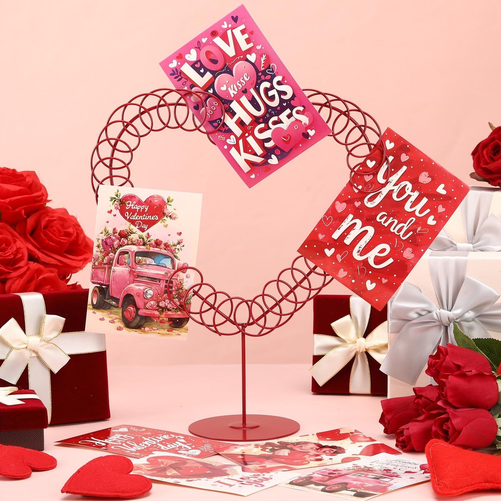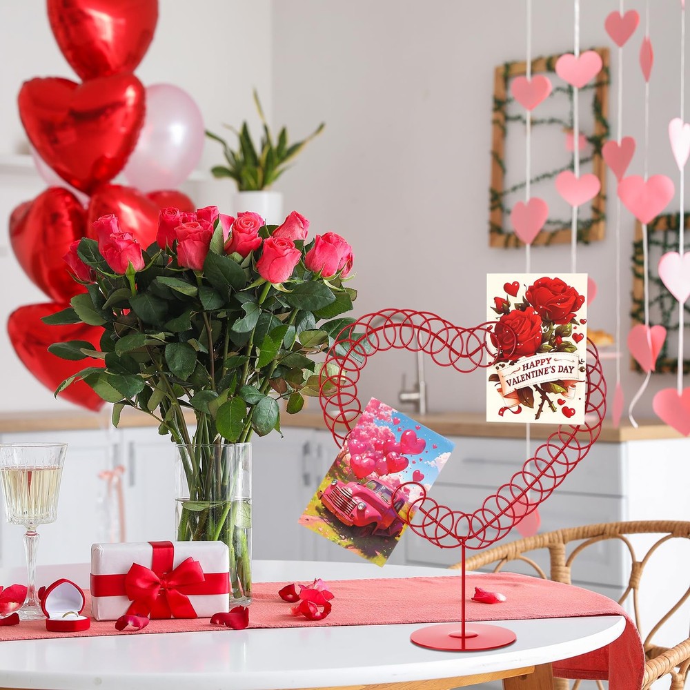 Features: The valentine card display stand is suitable for greeting cards, photos, postcards, etc., which encourages you to display and share your beautiful valentine cards without worrying about space constraints. The sturdy base of our valentine picture holder provides good bearing capacity, ensuring that the holder stays intact. This heart shaped is easy to install and doesn't take up much space. Specifications: Material: metal Color: red Size: approx. 11.81 x 15.75 inches/ 30 x 40 cm (D x H) Package includes: 1 x Valentine Notes: Manual measurement, please allow slight errors on size. The color may exist a slight difference due to different screen displays. Heart Shaped Card Wreath Holder: the overall height of our Valentines Day card wreath holder is about 15.75 inches/ 40 cm, and the diameter of the wreath is about 11.81 inches/ 30 cm; The wreath section comes with a spiral design with multiple spiral slots, enough to place multiple cards, photos and pictures Strong Material: the heart shaped is made of metal wire, strong, not easy to deform, break, rust or fade, ensuring long life; The removable metal base can allow you to move it anytime and anywhere, with the scene you want to use, to display your Valentines Day cards beautifully Unique Design: the charming red color and elegant heart shape add a fresh and sophisticated feel to your Valentines Day card holders; It displays your pictures in a stylish way, and adds a little Valentines Day atmosphere to your home or office, suitable for extending valentine celebrations Versatile Usages: the valentine card display stand can be applied to display , cards, pictures, photos, tickets, etc., easy to match other decorations, to bring you a good mood; You can also use it as a background to help you take many beautiful photos, and show your good aesthetic taste Wide Applications: the metal valentine gift card holders can be placed in various places, such as mantels, tables, windowsills, etc.; It is also suitable for offices, gift shops, and other places, to add a touch of elegance and charm to your place, creating a warm and festive atmosphere