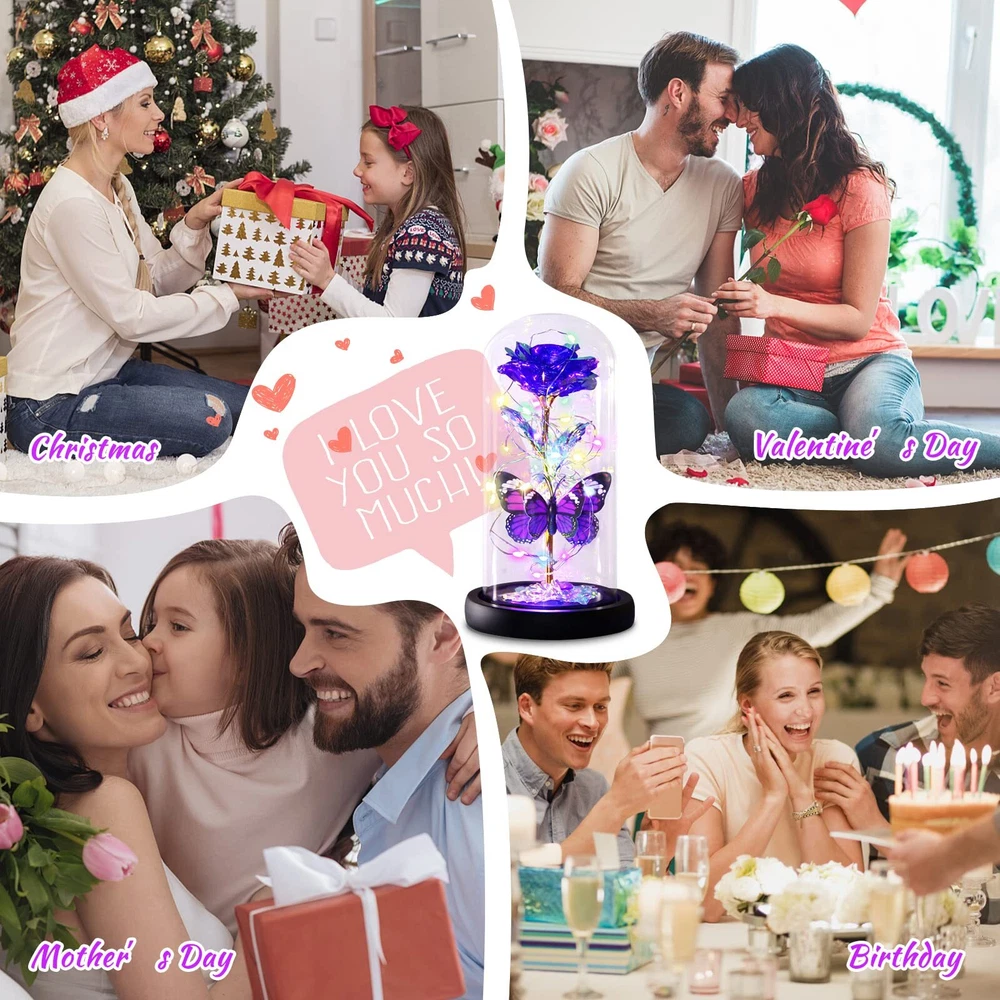 FOREVER ROSE FLOWER GIFT FOR HER - This beautiful purple rose flower in a glass dome will never wither or die, making it a perfect symbol of infinite hope, power and beauty, the image of a strong woman; Best Birthday Gifts, Anniversary Gifts, Mother's Day Gifts, Valentine's Day Gifts, Retirement Gifts, Graduation Gifts, Thanksgiving Day Gifts, Christmas Gifts, New Year Gifts and Rose Gift for Her, for lady of all ages LIGHT UP BUTTERFLY ROSE FLOWER GIFTS - Upgraded eternal rose comes with an unique purple butterfly, plus highly pure transparent glass dome, 360° shows the timeless and classic of the enchanted roses completely; Glass dome rose flowers light helps you switch to romantic moments and spaces in minutes, to create a love night she will never forget, and win her heart SUPRISE HER VALENTINES DAY - Updated EVA base pad fixedit, our unique glass dome can be removed easily for DIY! Add her prefer gifts such as rings, necklaces, bracelets, jewelries, or other novelty gifts she want; Ideal women gifts for mom, wife, fiancee, girlfriend, step mom, mother-in-law, grandma, aunt, sister, daughter, friends, teachers, or co-worker, to show them all the love and appreciation they deserve on her special day TIMELESS ROSE GIFTS FOR WOMEN - Want to keep the most memorable moments close to her heart? Everlasting rose is mysterious and beautiful, and butterfly represents beauty, freedom, uniqueness, and auspiciousness; No matter you are looking for mother-in-law or mom gifts from son or daughter, love gifts from husband or boyfriend, daughter gifts from parents, teacher gifts from students, or just Thank You presents for any females, choose this artificial rose preserved flowers for delivery THE BEAUTY AND BEAST ROSE VALENTINES DAY DECOR - Light up butterfly and rose flower is wrapped around a Colorful Lights which brights fancy and fairy lighting, powered by 3 AAA power(not included); LED Enchanted Rose is a beautiful piece of decor in any light, but truly shines as romantic ambient lighting in a low-lit room; Perfect on the nightstand, a display shelf, camping night, or as a centerpiece to light a romantic dinner!