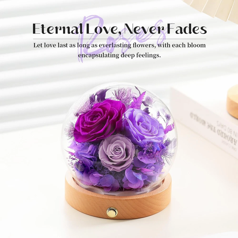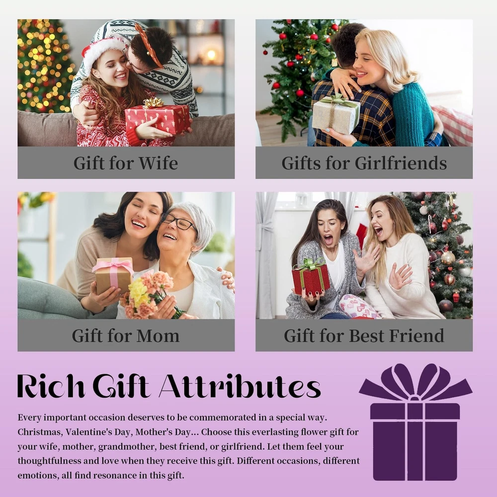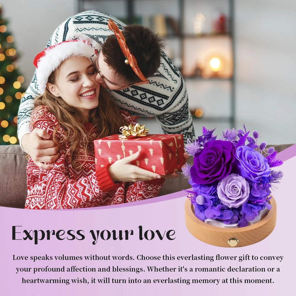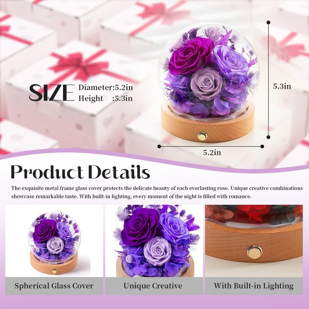 Valentines Day Roses Gifts for Her,Forever Preserved Flowers Roses in Glass Dome,Roses Gifts for Wife Mom Women Daughter Best Friend/Purple Product Details Color: Purple Brand: Agrul MPN: Does not apply UPC: Does not apply EAN: Does not apply Package Dimensions: 6.1 x 5.98 x 5.98 inches Item Weight: 14 ounces Batteries required: No Eternal Beauty, Romantic Gift:This everlasting flower symbolizes romance and eternity. Carefully selected and treated, it maintains long-lasting vibrancy, adding beauty to your life and making it a perfect romantic gift. Elegant Design:The elegant design combines craftsmanship with creativity. The sturdy wooden base and crystal-clear glass cover showcase the flower's beauty, making it a sophisticated choice for home decor or gift-giving. Color Options, Catering to Preferences:Available in pink, blue, purple, and red, this everlasting flower caters to different tastes and occasions, ensuring a perfect match for any gift recipient. Festival Gift:Ideal for special occasions, this flower conveys heartfelt blessings and adds a romantic touch to Christmas, Valentine's Day, Mother's Day, and birthdays. Sharing Warmth:Suitable for various gift-giving scenarios, this everlasting flower is a perfect choice to express affection and blessings to graceful ladies, loving mothers, close friends, gentle wives, kind grandmothers, and dear sisters. Forever Real Roses in Glass Dome